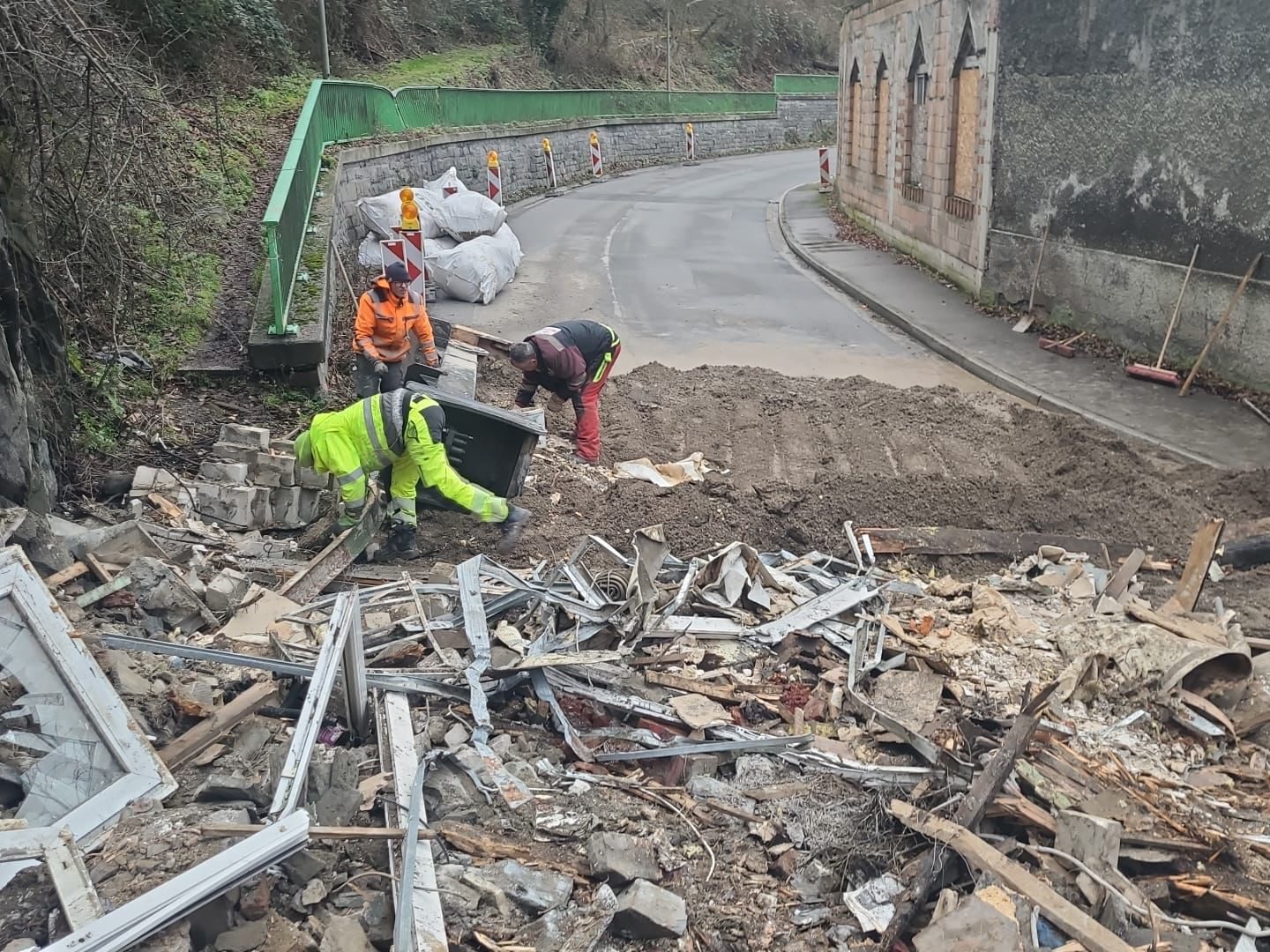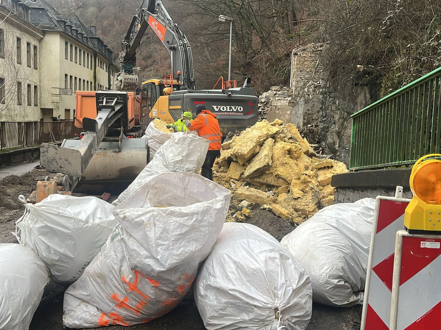 Siegmund Müller hat zusammen mit seinem Team am Samstagmorgen alles rund um den Abrissbereich aufgeräumt, so dass jetzt die B 236, als wichtige Verkehrsverbindung zwischen Altena und Werdohl wieder frei ist und der Verkehr rollt. Bereits am Freitagabend hatte Müller vom gleichnamigen Tiefbau- und Abbruchunternehmen aus Wiblingwerde sich zuversichtlich gezeigt: „Samstagmittag sollte die Bundesstraße in diesem Bereich frei geräumt sein“. Sieben Mitarbeiter des Abrissunternehmens waren heute unermüdlich im Einsatz, um die Reste des Hauses abzureißen und den Schutt zu beseitigen. Mehr als 220 Tonnen sind bereits verladen und abtransportiert worden.