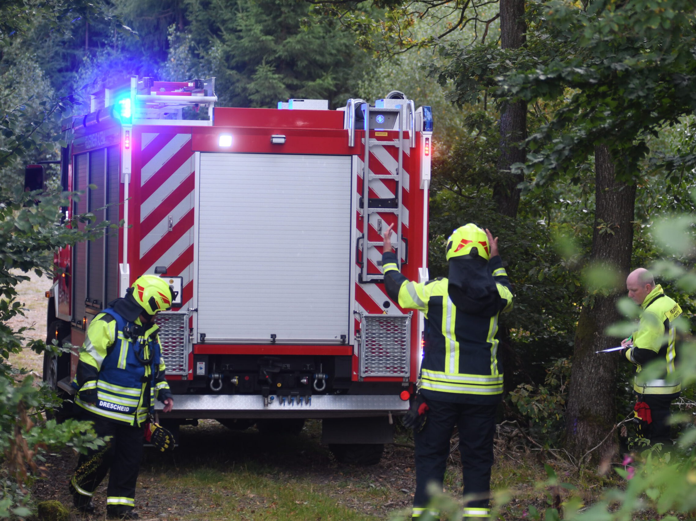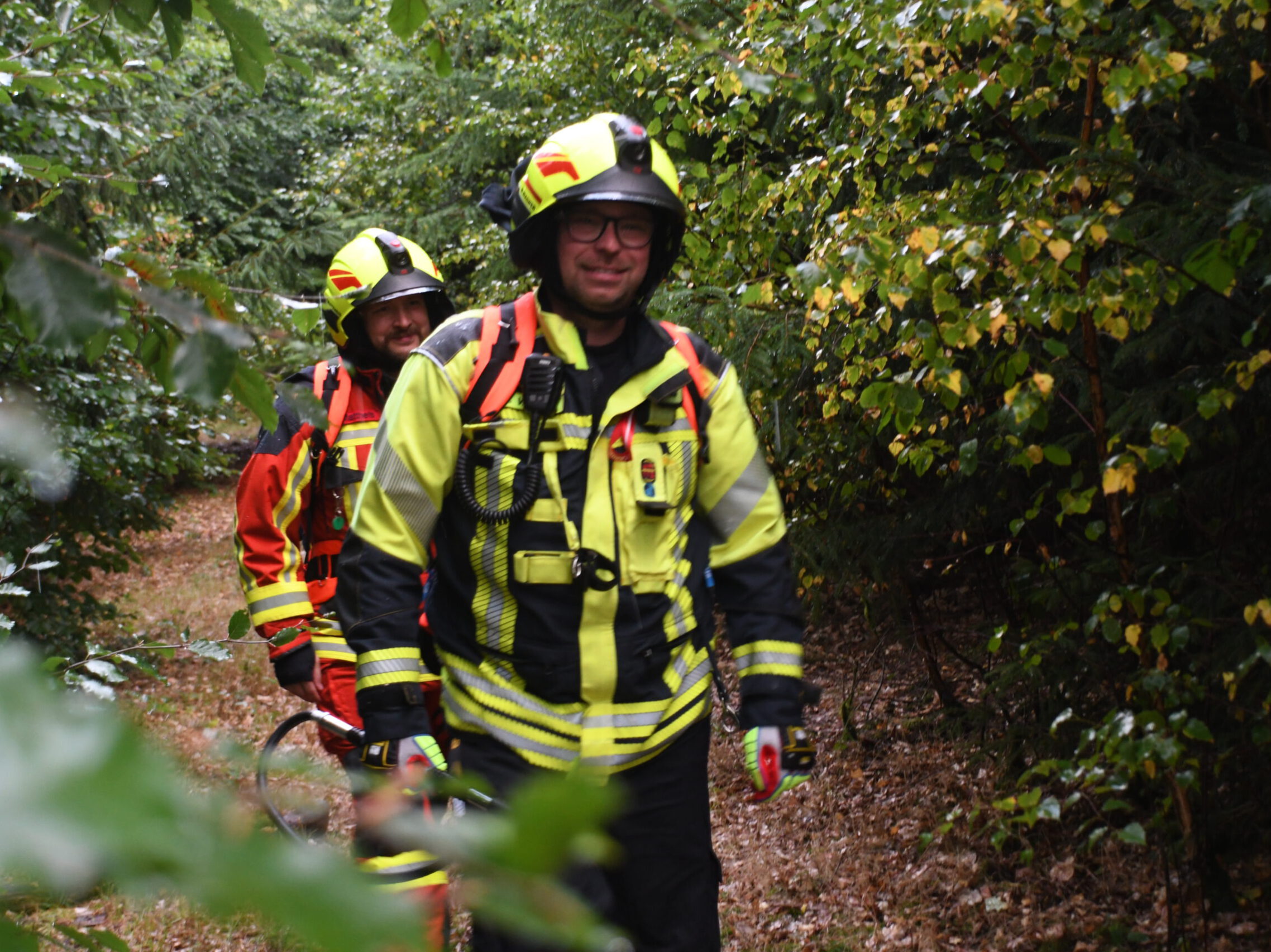 Die erste Besonderheit war bereits die Alarmierung. Sie erfolgte nicht über Koordinaten oder vage Ortsangaben, sondern über eine Drei-Wort-Adresse (What3Words); dazu ist nahezu jeder Ort auf der Welt in drei mal drei Meter große Quadrate eingeteilt, denen jedes in Landessprache eine Drei-Wort-Kennung zugewiesen ist. „Über eine App im Smartphone lässt sich dieser Ort dann lokalisieren“, erläuterte Kai Spelsberg. Punkt 18.28 Uhr erfolgte die Alarmierung: Aufsteigender Rauch aus einem Waldstück mit der Kennung „bewölkt/neutral/anzusehen“.