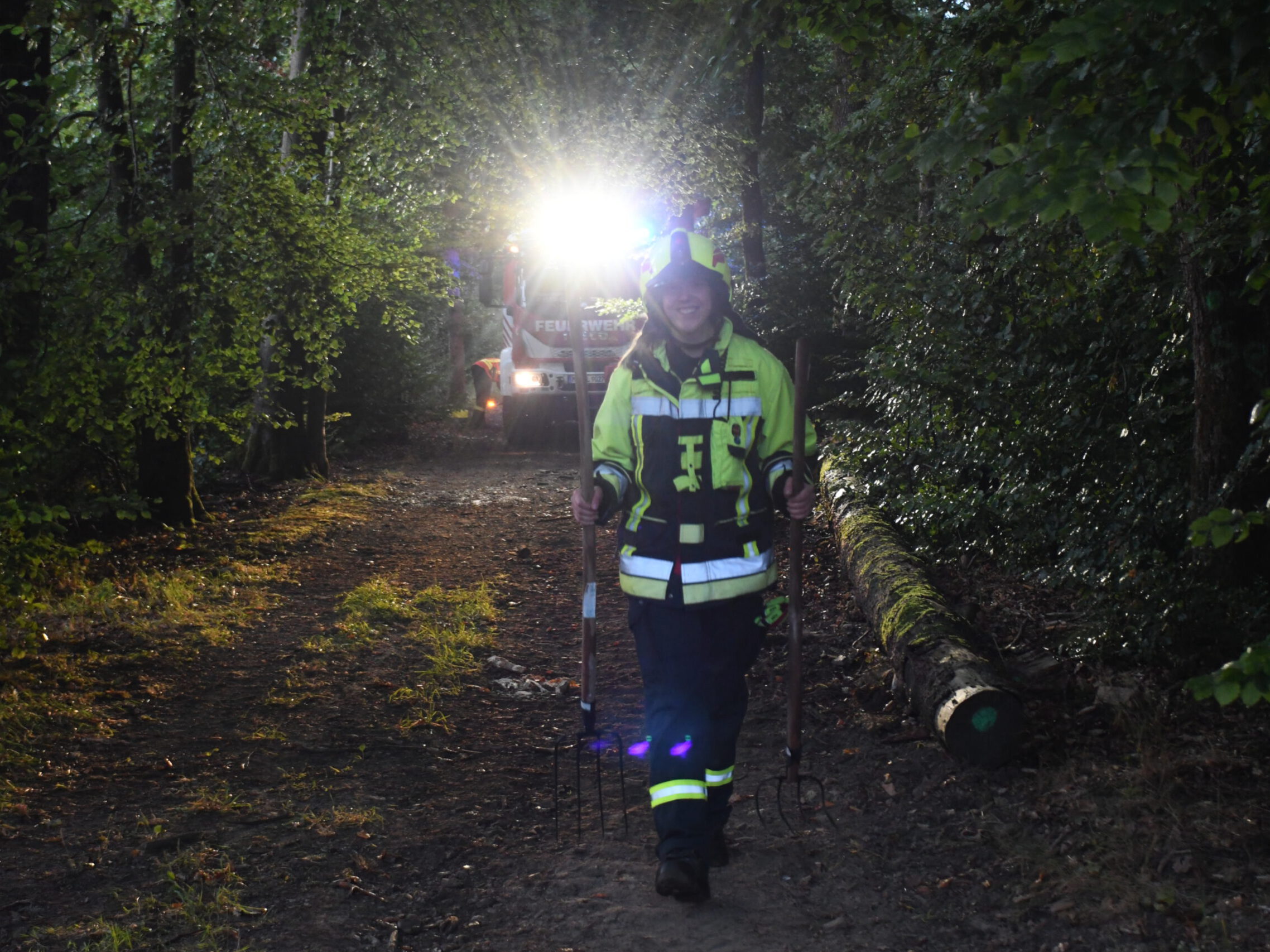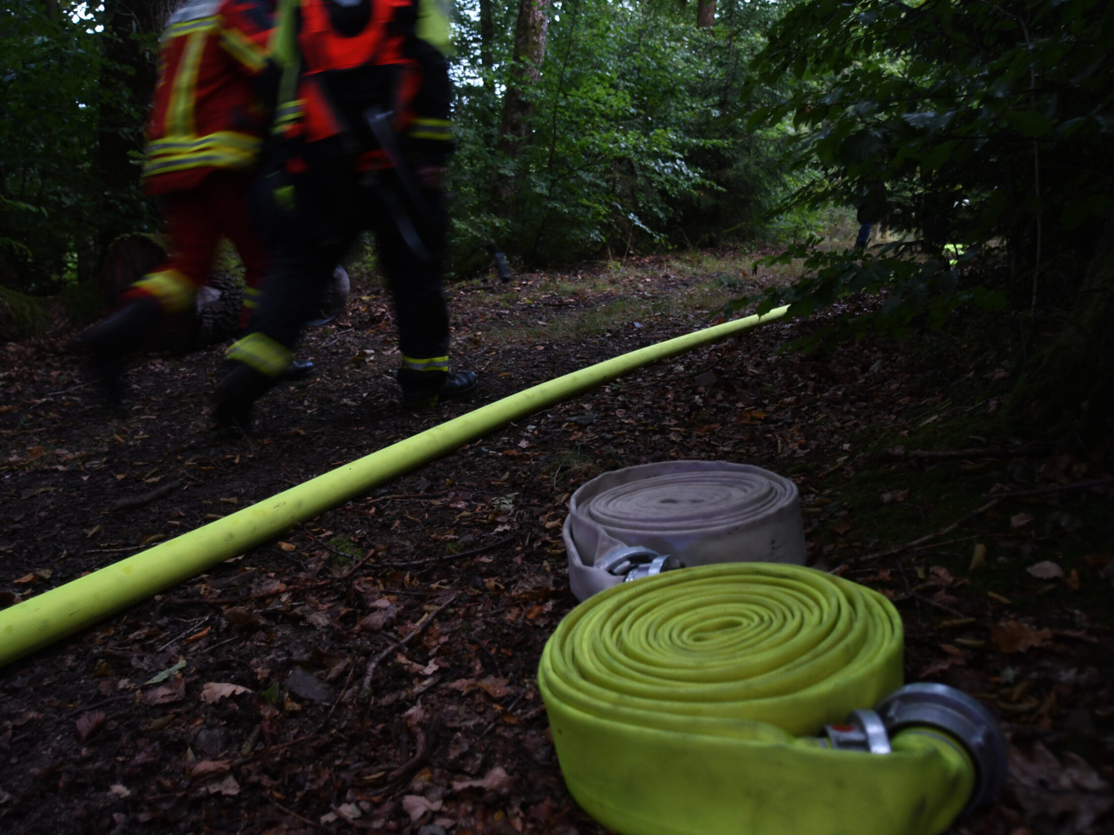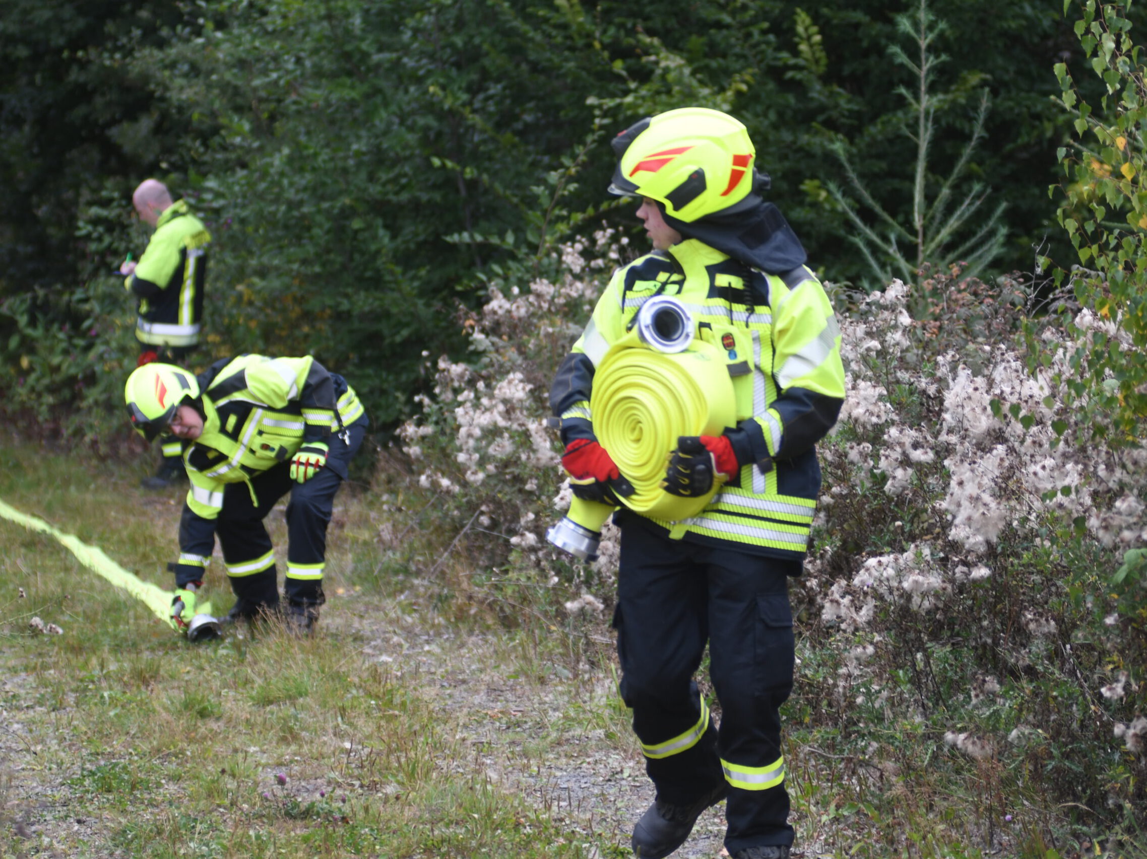 19.05 Uhr: „Wir brauchen mehr Personal!“, forderte ein Feuerwehrmann an der Einsatzstelle Verstärkung an. „Jede Menge mehr!“, bekam er Zuspruch vom nächsten. Und so kamen nach und nach alle Einheiten zum Einsatz, die den angenommen Waldbrand von zwei Seiten bekämpften. Mit kleinen D-Rohren, deren Schläuche gut im Gelände zu führen sind, mit Kreisregnern, die das Wasser wie Rasensprenger verteilen, mit Löschrucksäcken, mit Hacke, Schaufel und Kettensäge, um eine Schneise zu schlagen.