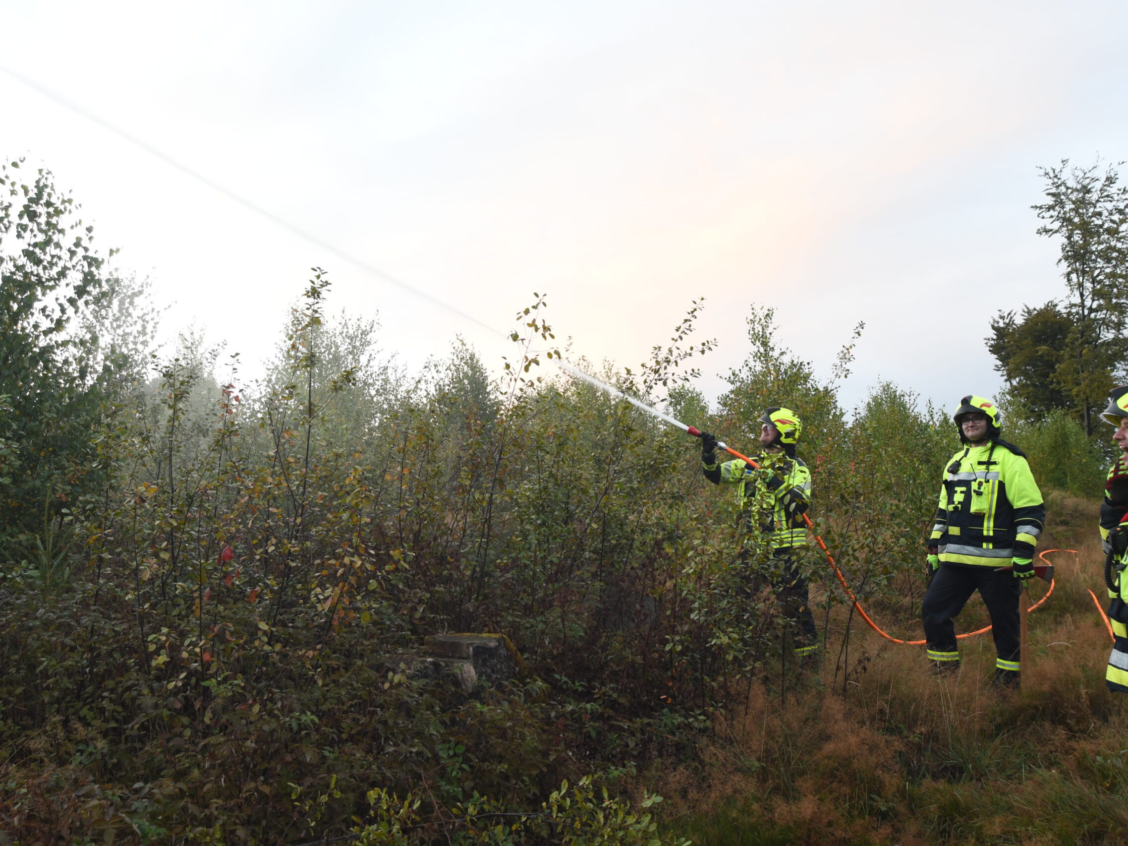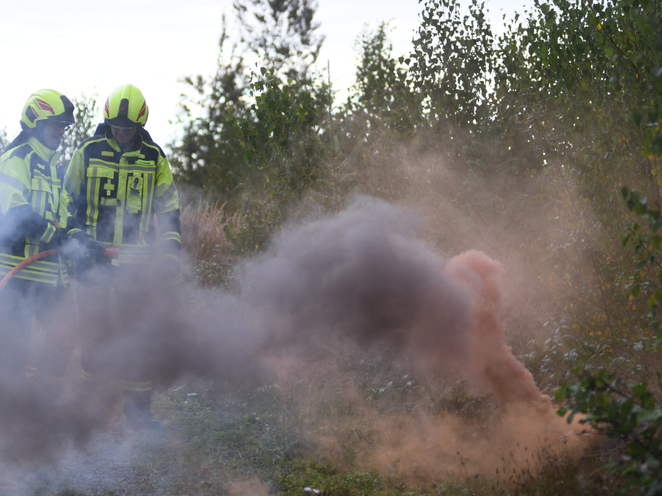 Und für Rauch war reichlich gesorgt. Dirk Hartkopf betätigte sich quasi als Brandstifter und zündete einen Rauchtopf nach dem anderen. Der teils tief schwarze, teils grellorange Rauch markierte für die Feuerwehrleute das vermeintlich brennende Waldstück.