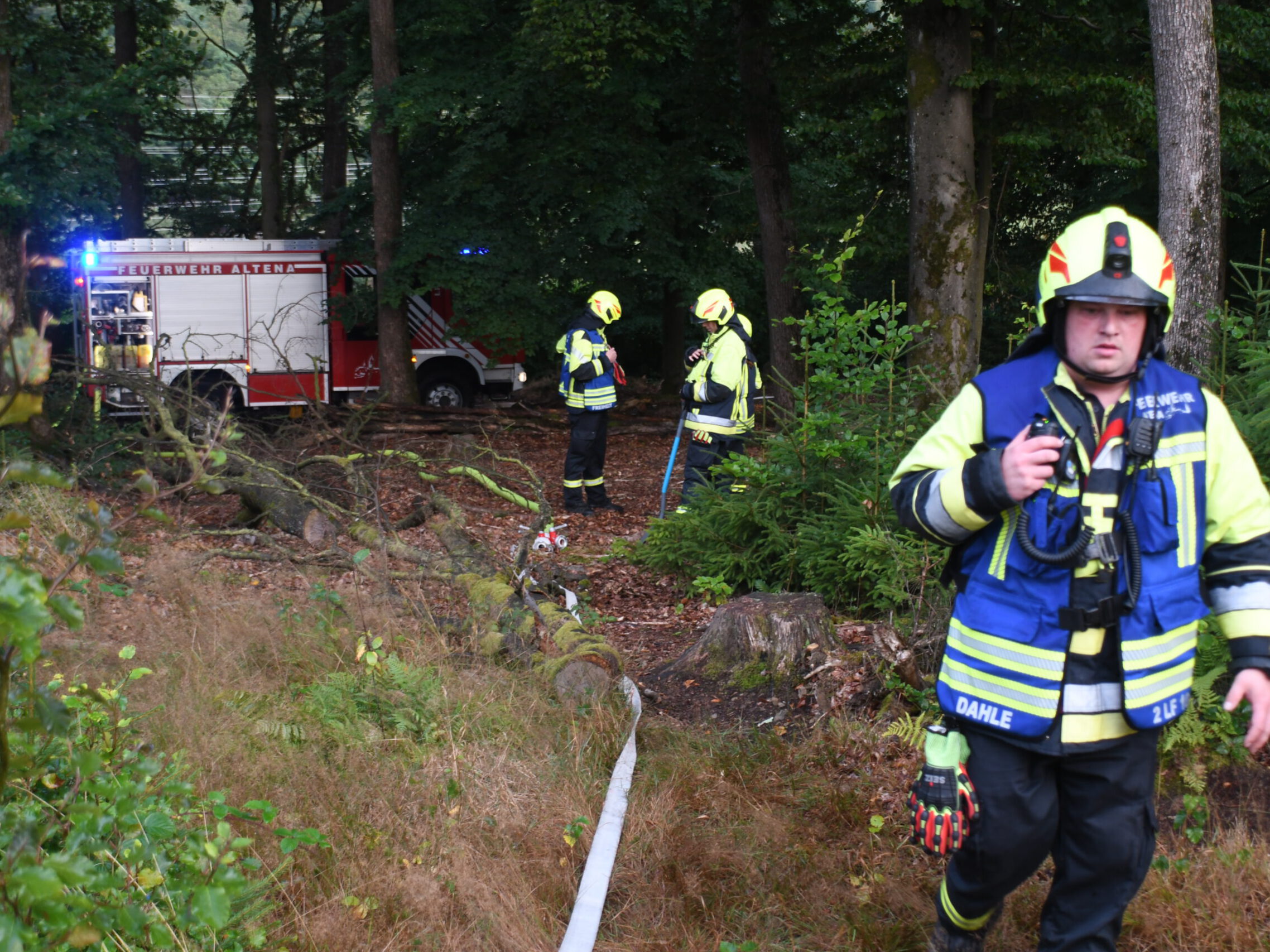 Altena-Rahmede. „Es kann sein, dass einige von euch gleich mit der Kettensäge arbeiten müssen“, gab Stadtbrandinspektor Kai Spelsberg der versammelten Altenaer Feuerwehr mit auf den Weg in den Wald: Mit einer groß angelegten Übung trainierten alle Einheiten am Freitagabend den Ernstfall in einem abgelegenen Waldstück zwischen Rosmart und Hemecker Weg.