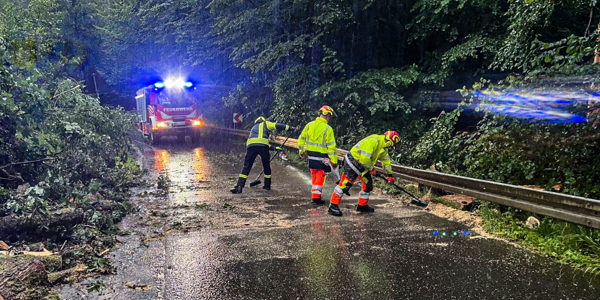 Die Besatzung des Hilfeleistungs-Löschfahrzeugs (HLF) zerkleinerte den Baum, der die Straße auf der gesamten Breite blockierte, mit einer Kettensäge, schaffte die Baumteile an die Seite und säuberte anschließend die Fahrbahn mit Laubbläser und Besen.