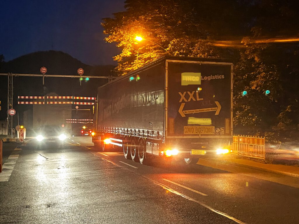 Immer wieder versuchten Lkw die Umleitung zu umgehen, bis sie vor der Höhenbegrenzung auf der Bundesstraße rückwärts rangieren und drehen mussten, wie hier ein Laster am 23. September 2023. Foto: Carsten Menzel