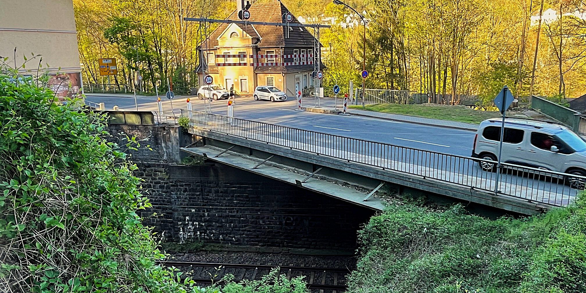 Die rund 17 Meter lange Brücke der Bahnhofstraße (B 236) über die Ruhr-Sieg-Strecke ist seit Januar 2023 für Lkw über 3,5 Tonnen gesperrt und muss ersetzt werden. Foto: Carsten Menzel