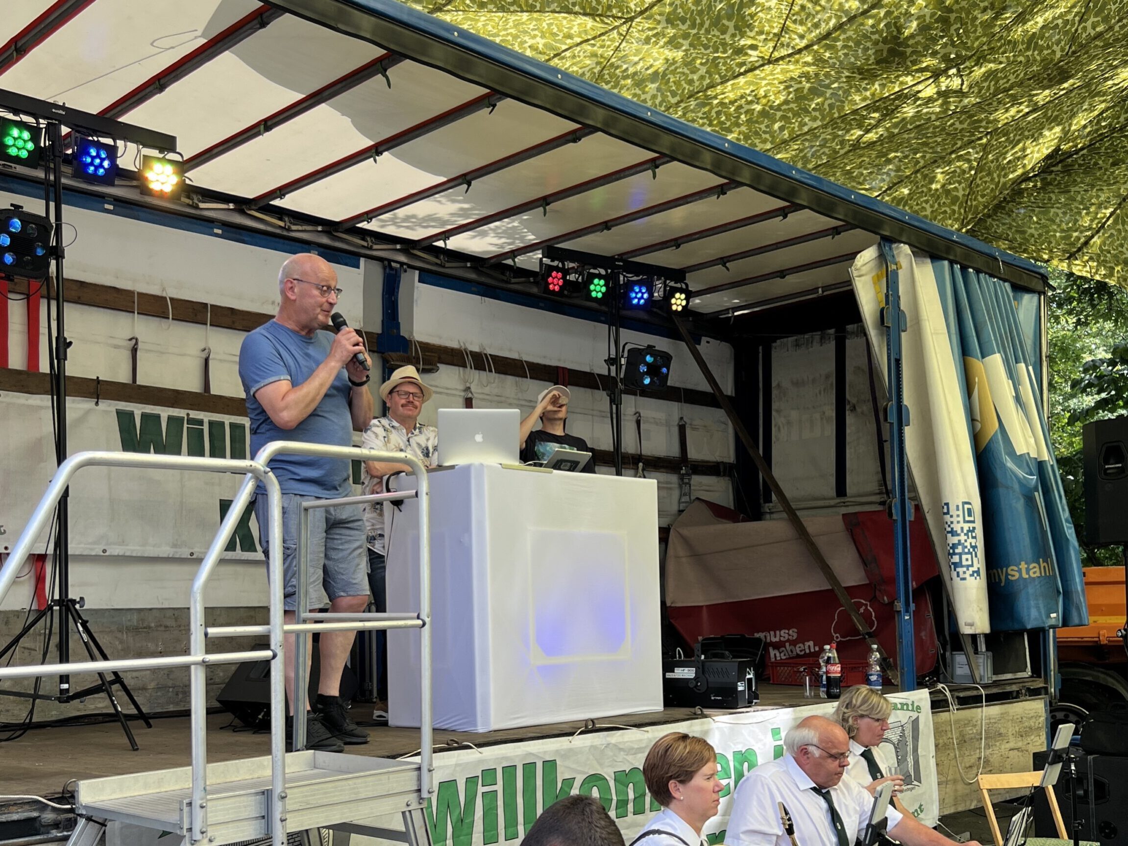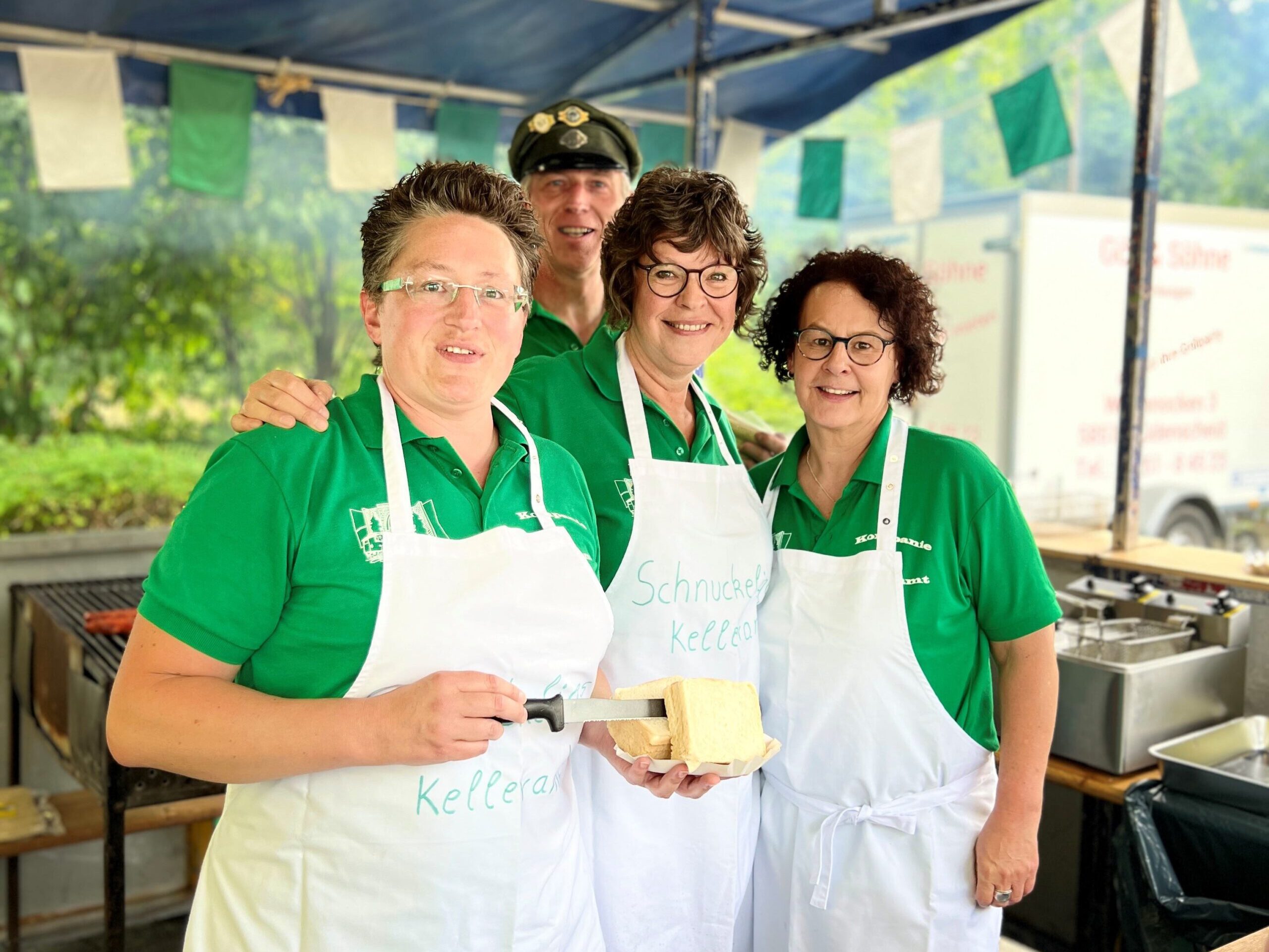 Clown Trine sorgte für eine abwechslungsreiche, interaktive Show aus Clownerie, Zauberei und Jonglage und versetzte ihre kleinen Zuschauer in Staunen. Zudem modellierte sie aus bunten Ballons Tiere, die die Kinderaugen zum Leuten brachten. Wer sich bei dem Schweiß treibenden Wetter zwischendurch abkühlen wollte, stellte sich vor die Wasserschlauch-Fontäne. Die Kompanie Kelleramt hatte ein reichhaltiges Kuchenbuffet aufgebaut, am Imbissstand gab es leckere Pommes und Gegrilltes. Dazu schmeckte natürlich das eine oder andere Kaltgetränk vom Bierwagen. Für die musikalische Unterhaltung sorgten das Blasorchester Altena und ein DJ.