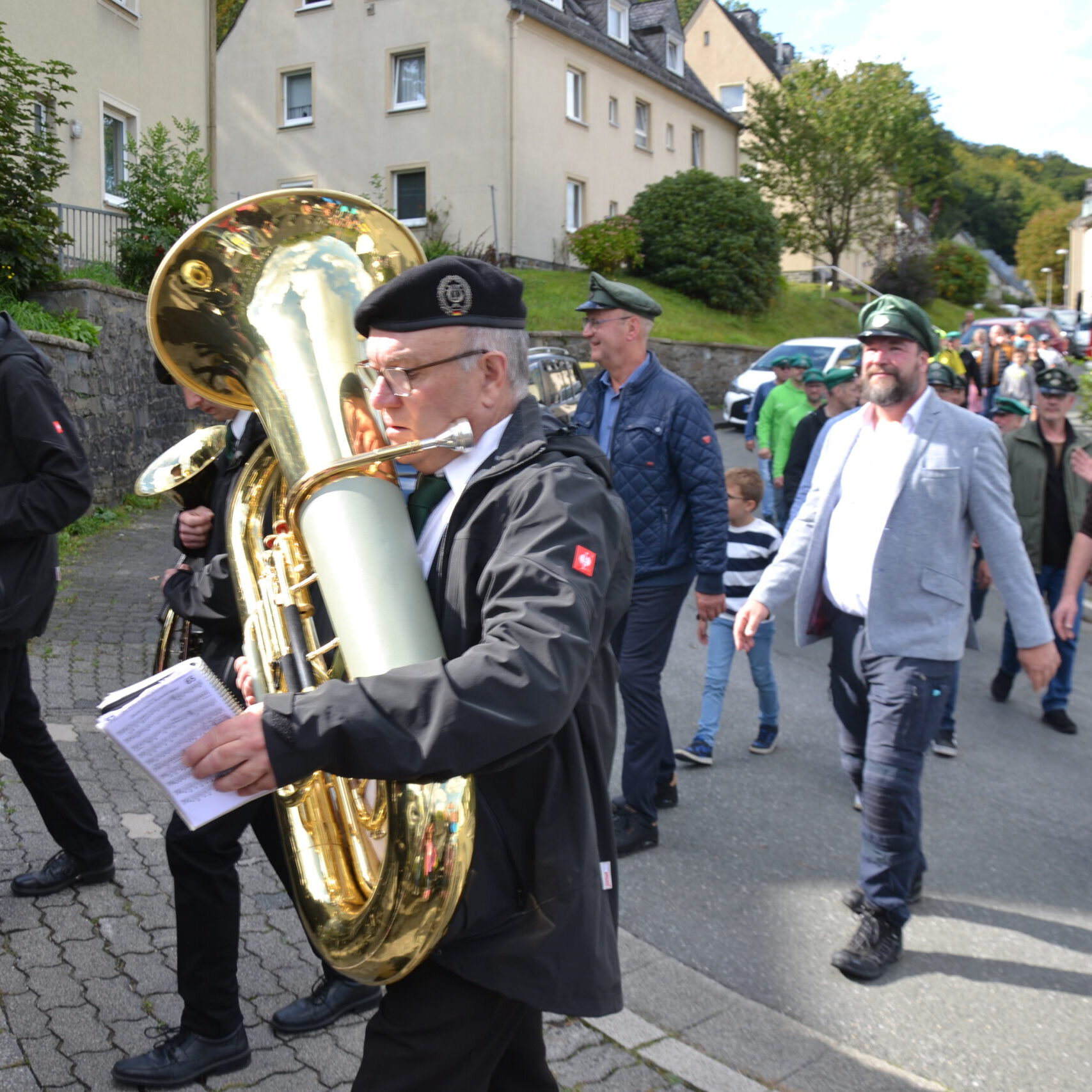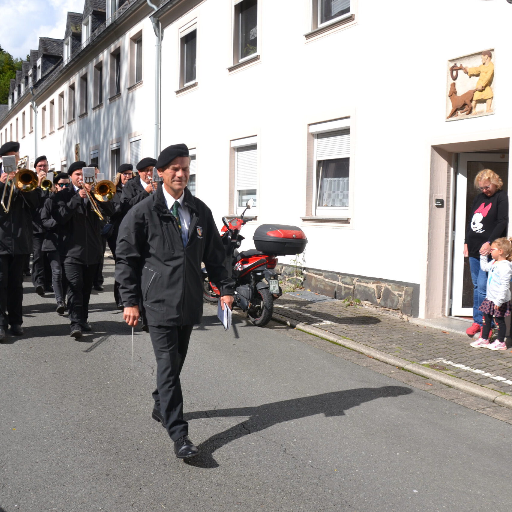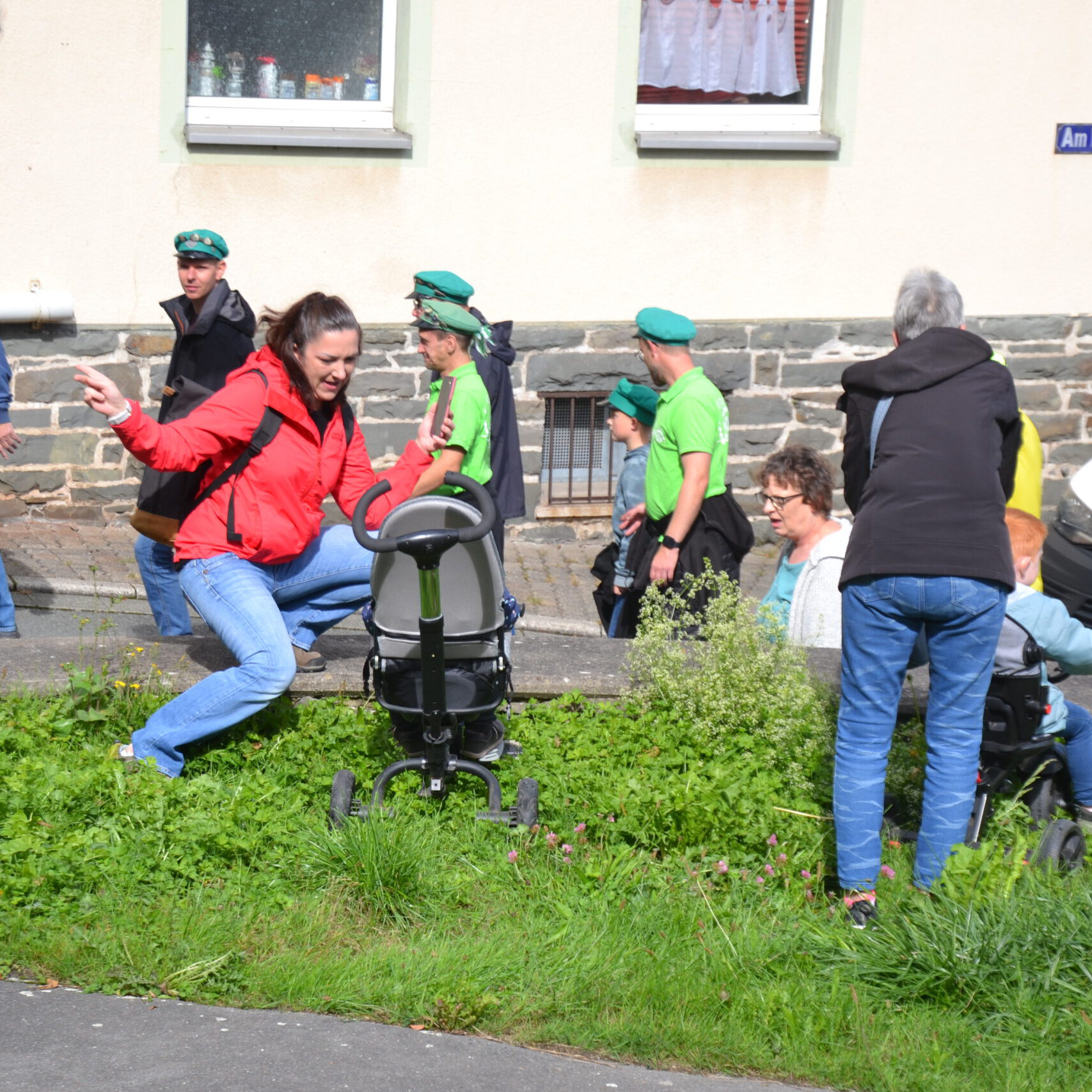 Angeführt vom Musikzug Versetal zog der Festumzug anschließend durch die Siedlung. Erste Station war am Brunnen, der ehemaligen Pferdetränke, die in diesem Jahr 100 Jahre alt wird. Tobias Röbbecke und David Kellner hingen die von Kornelia Schneider und ihrem Mann im Kränzebinder-Stil angefertigte 100 auf. Mit guter Stimmung und Marschmusik ging es dann über Am Papenberg durch die komplette Siedlung bis zur ehemaligen Knerlingschule, begleitet von aufgeregten kleinen Jungs und winkenden Bewohnerinnen und Bewohnern, die am Straßenrand oder in den Haustüren standen oder aus dem Fenster zuschauten. Auf dem Festplatz angekommen, eröffnete Bürgermeister Uwe Kober offiziell das Brunnenfest. Dabei machte er nicht viele Worte, dankte all denen, die dieses Fest möglich gemacht hatten und wünschte allen: „Habt viel Spaß.“