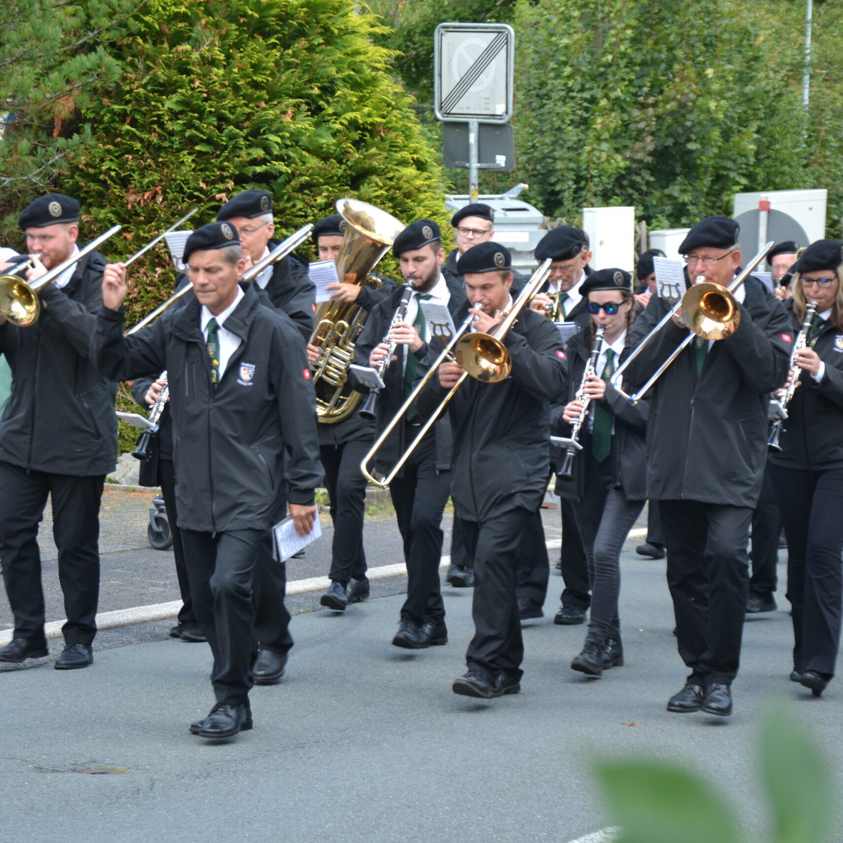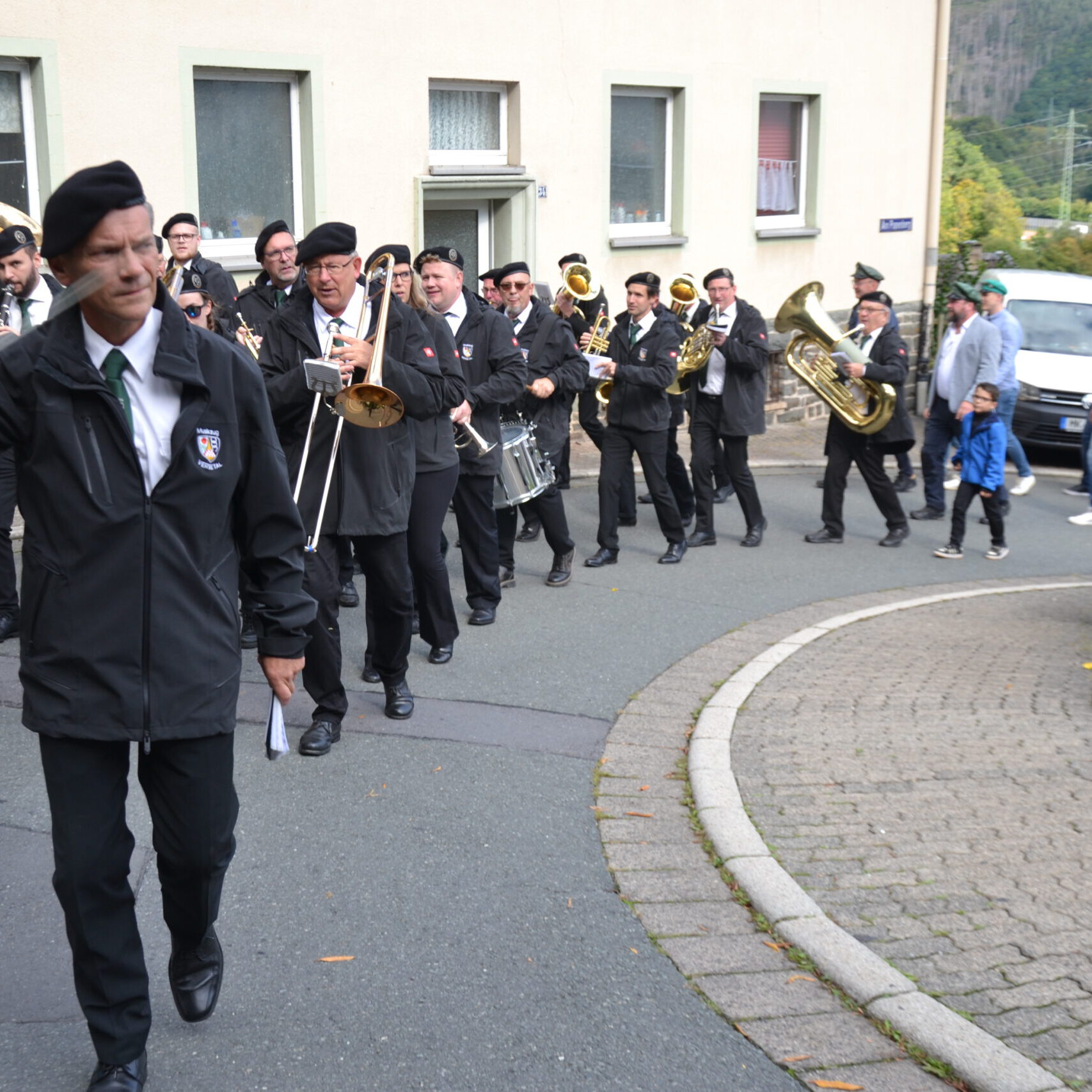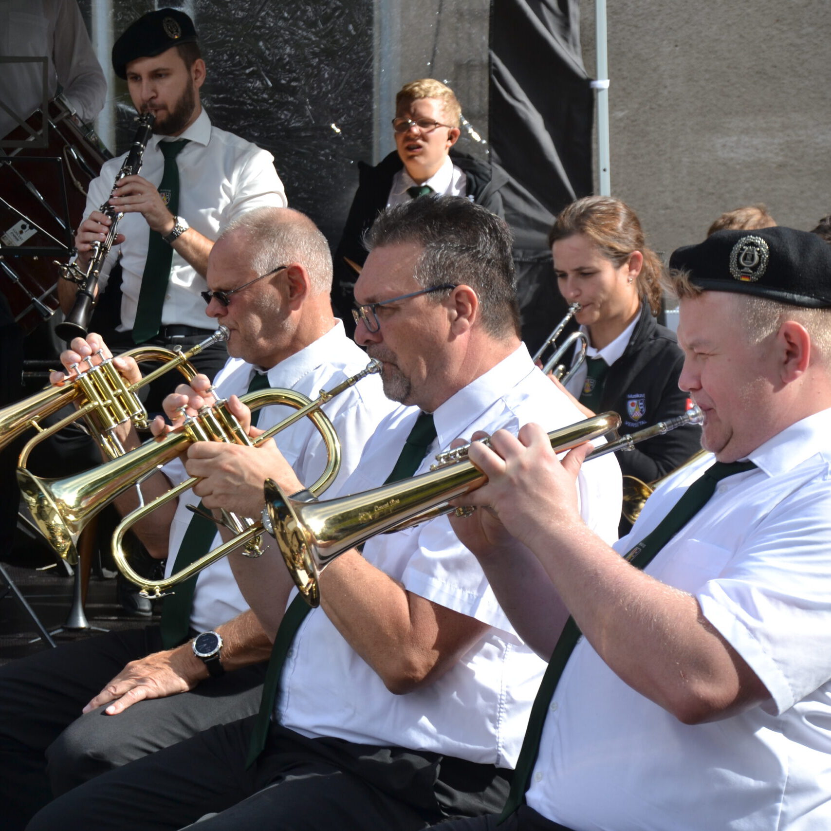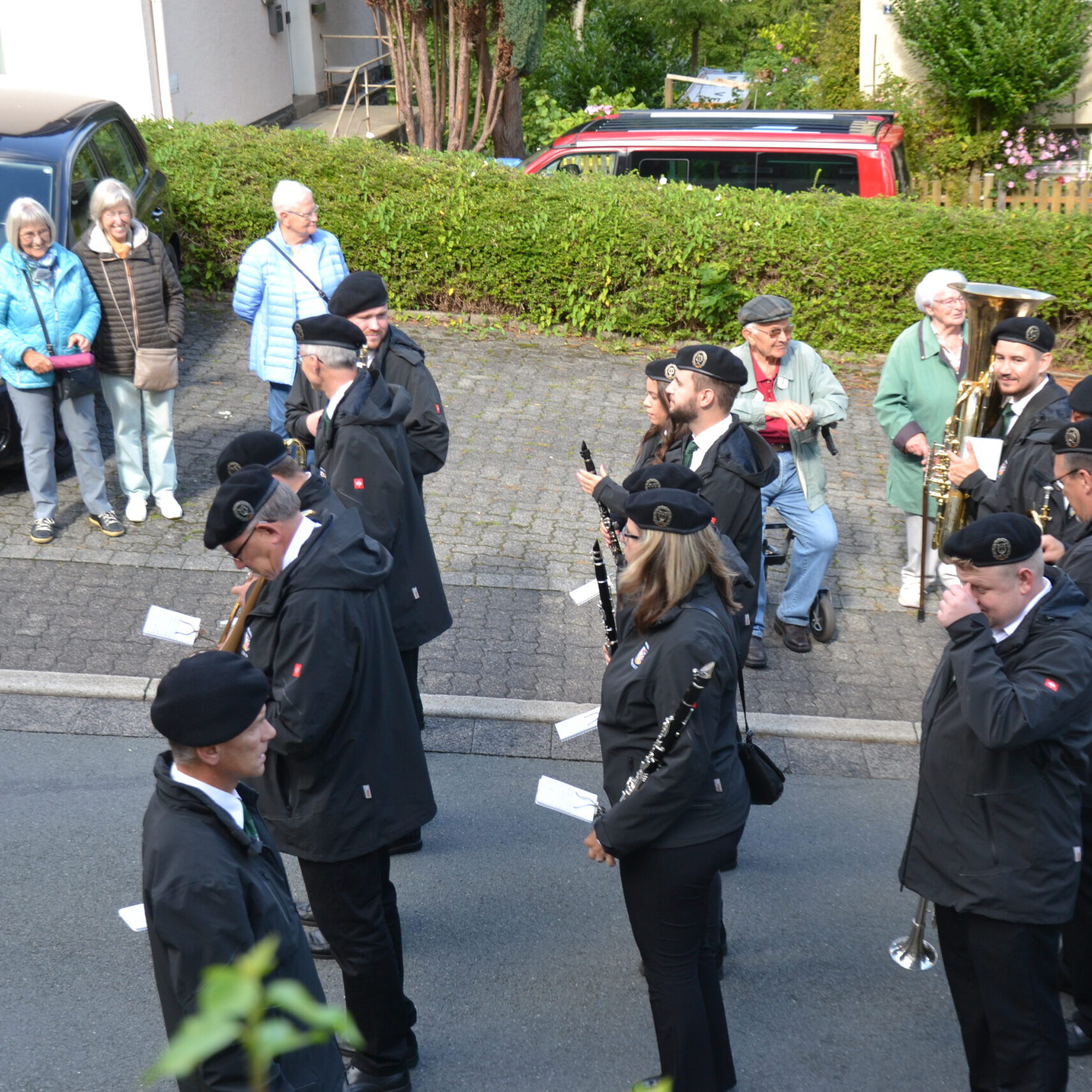 Angeführt vom Musikzug Versetal zog der Festumzug anschließend durch die Siedlung. Erste Station war am Brunnen, der ehemaligen Pferdetränke, die in diesem Jahr 100 Jahre alt wird. Tobias Röbbecke und David Kellner hingen die von Kornelia Schneider und ihrem Mann im Kränzebinder-Stil angefertigte 100 auf. Mit guter Stimmung und Marschmusik ging es dann über Am Papenberg durch die komplette Siedlung bis zur ehemaligen Knerlingschule, begleitet von aufgeregten kleinen Jungs und winkenden Bewohnerinnen und Bewohnern, die am Straßenrand oder in den Haustüren standen oder aus dem Fenster zuschauten. Auf dem Festplatz angekommen, eröffnete Bürgermeister Uwe Kober offiziell das Brunnenfest. Dabei machte er nicht viele Worte, dankte all denen, die dieses Fest möglich gemacht hatten und wünschte allen: „Habt viel Spaß.“