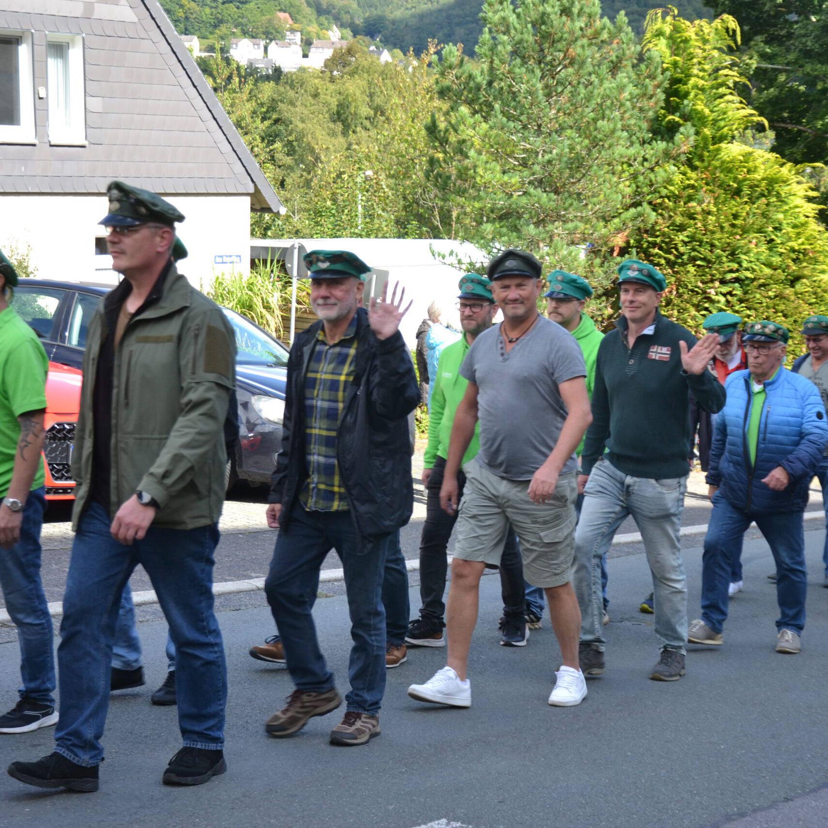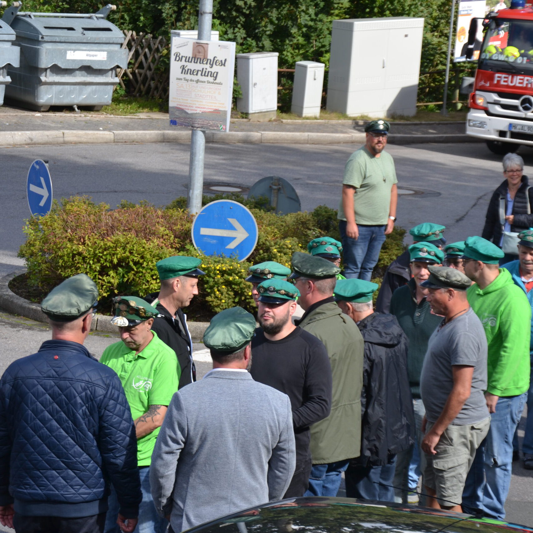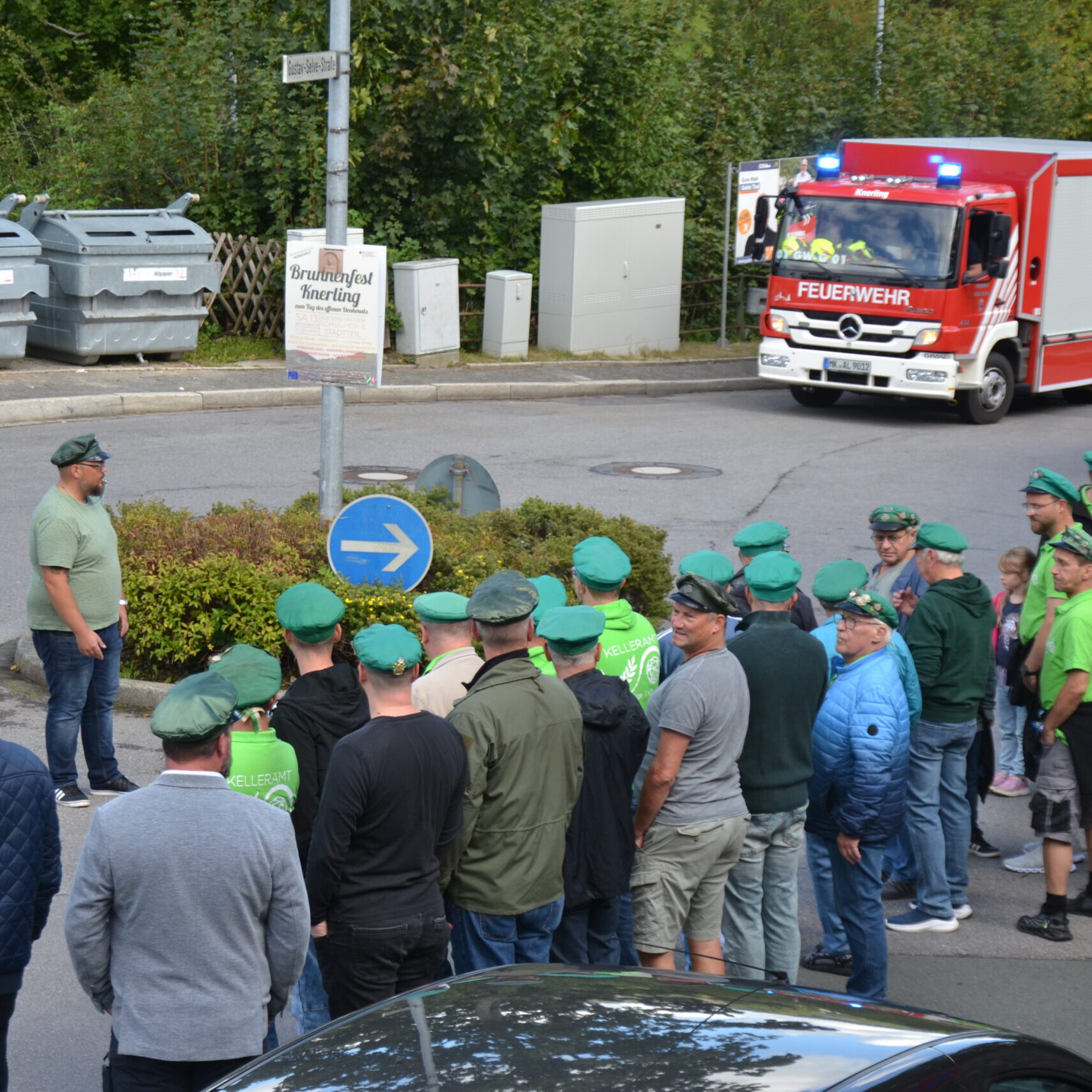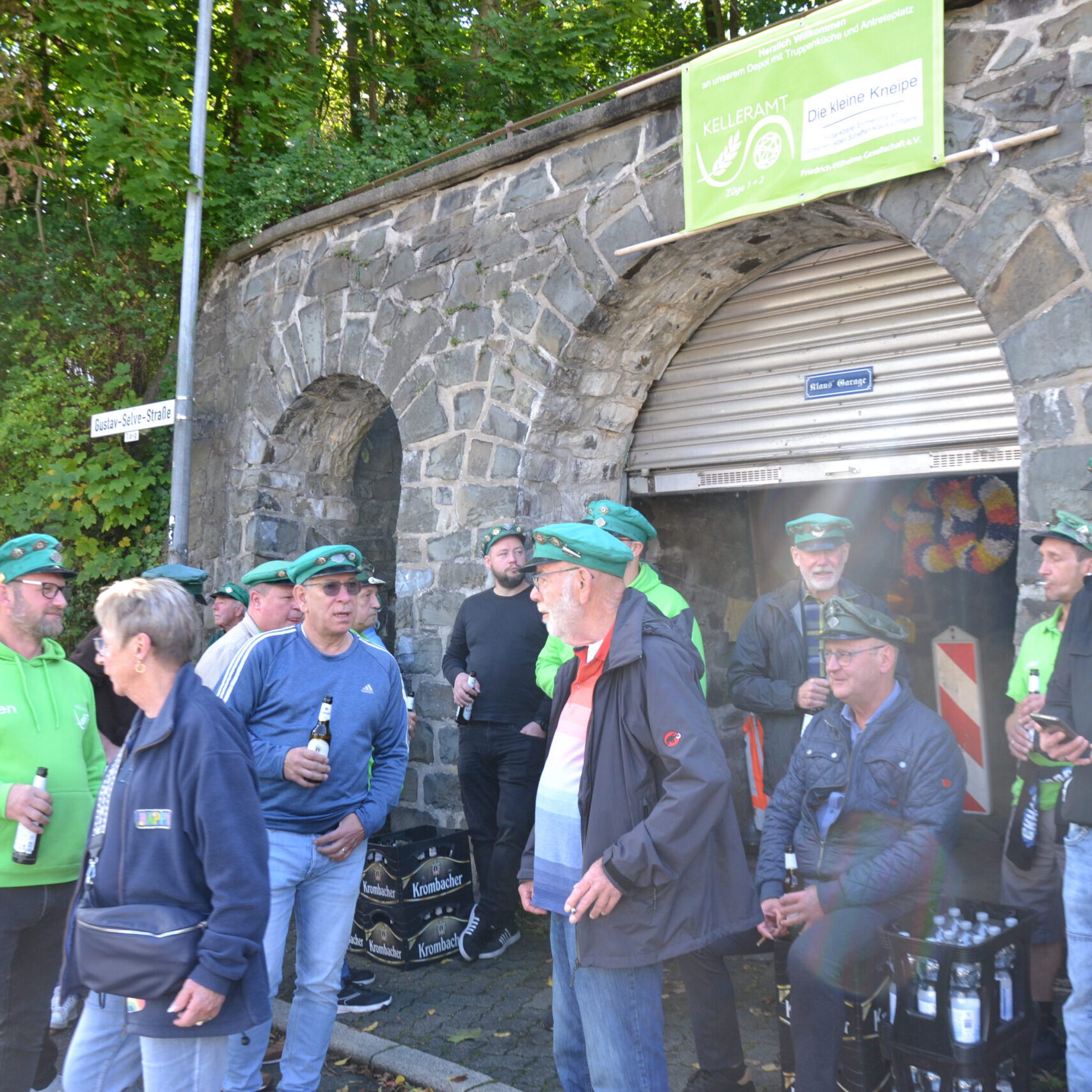 Los ging es am Treffpunkt Knerling-Kreisel – genauer gesagt an der ehemaligen Garage von Klaus Löttgers, dem Begründer des ursprünglichen Brunnenfestes. Heute wird der Ort liebevoll „die kleine Kneipe“ genannt und dient für die Schützen der Kompanie Kelleramt immer als geselliger Startpunkt. Dort sammelten sie sich am Samstag auch, um sich bei einem kleinen Bier auf den bevorstehenden Festmarsch einzustimmen.