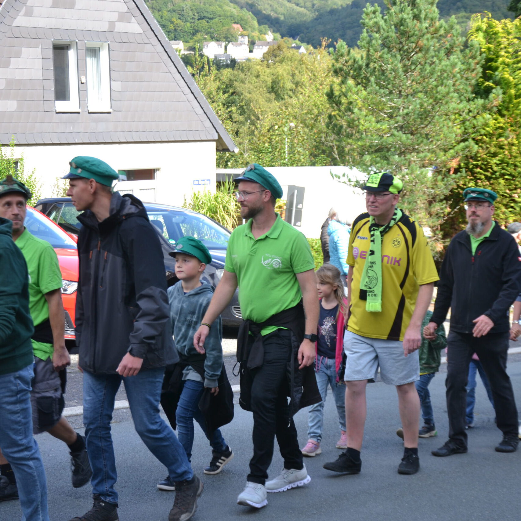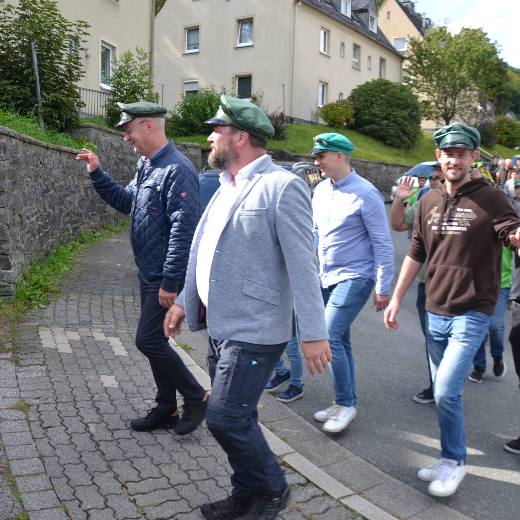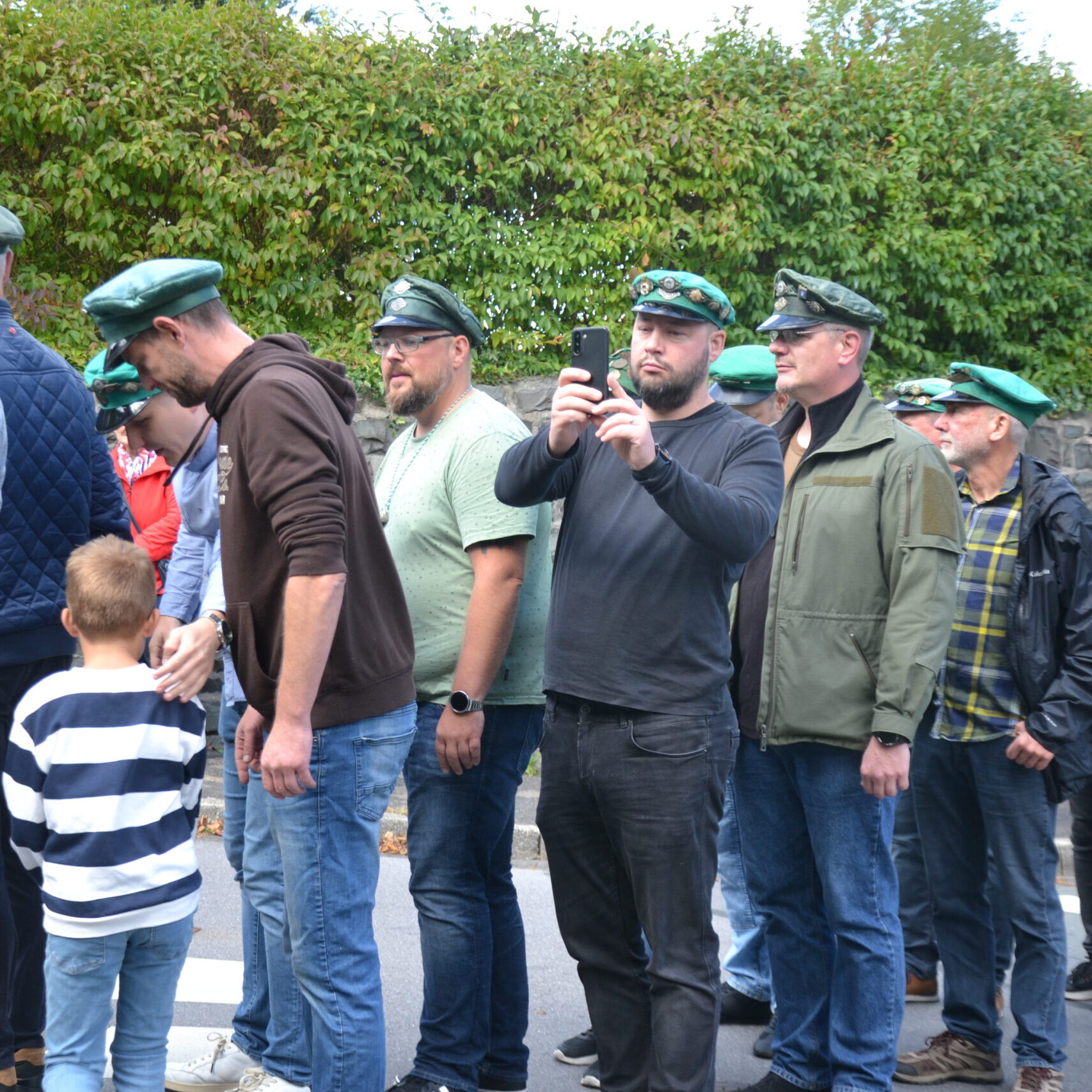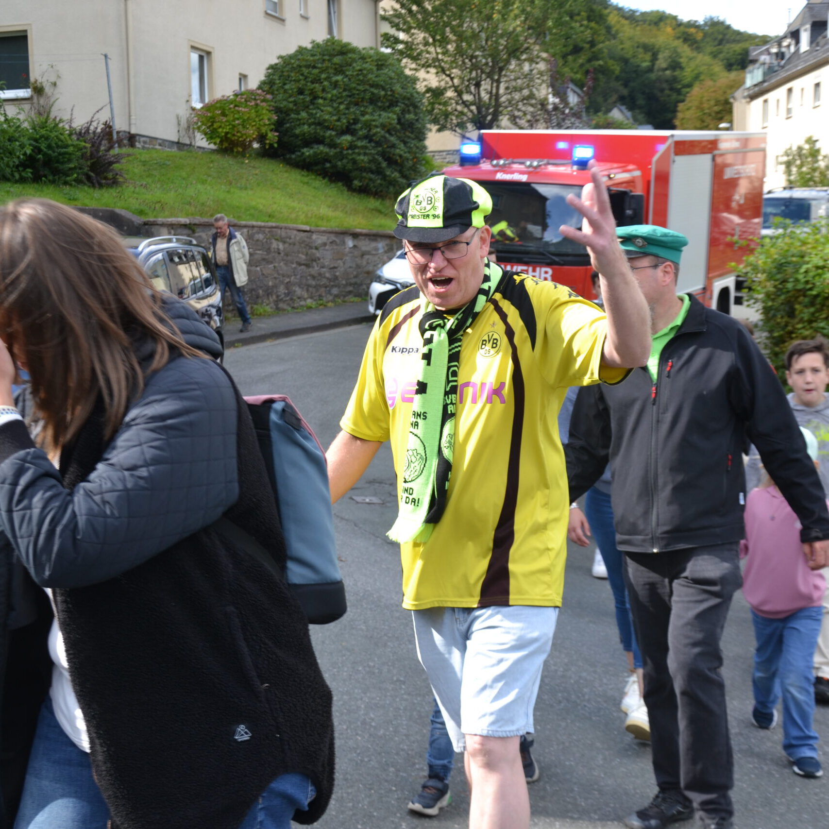 Los ging es am Treffpunkt Knerling-Kreisel – genauer gesagt an der ehemaligen Garage von Klaus Löttgers, dem Begründer des ursprünglichen Brunnenfestes. Heute wird der Ort liebevoll „die kleine Kneipe“ genannt und dient für die Schützen der Kompanie Kelleramt immer als geselliger Startpunkt. Dort sammelten sie sich am Samstag auch, um sich bei einem kleinen Bier auf den bevorstehenden Festmarsch einzustimmen.