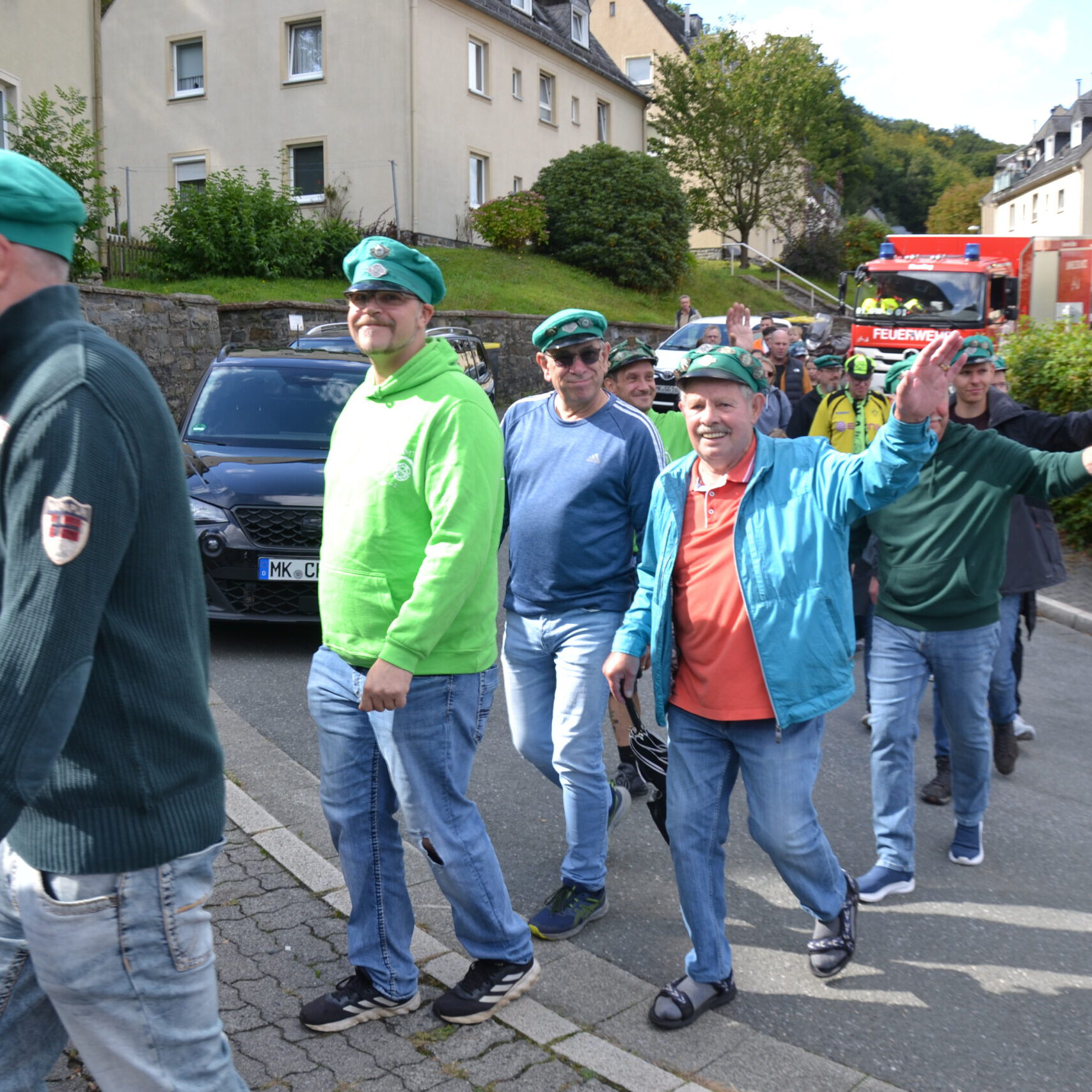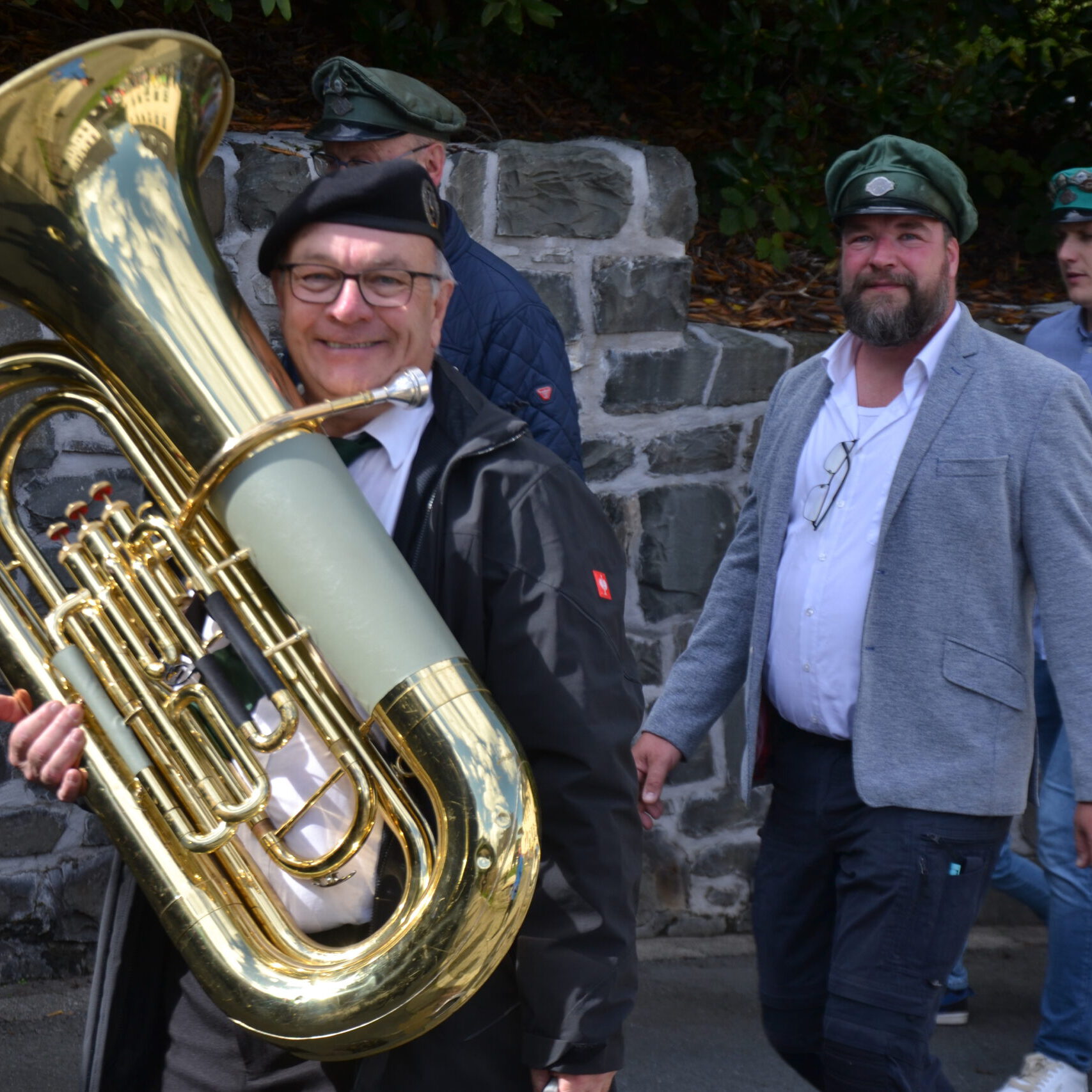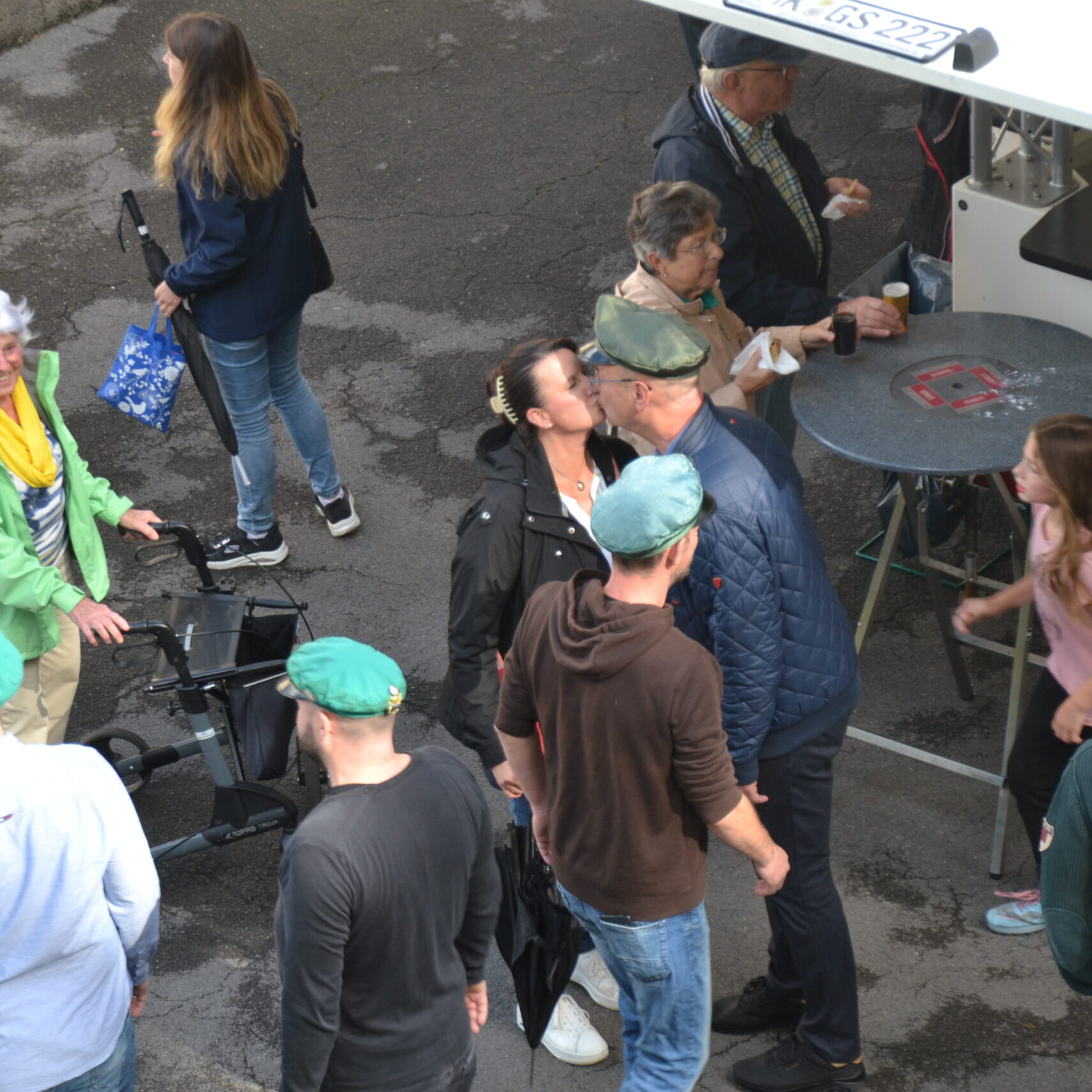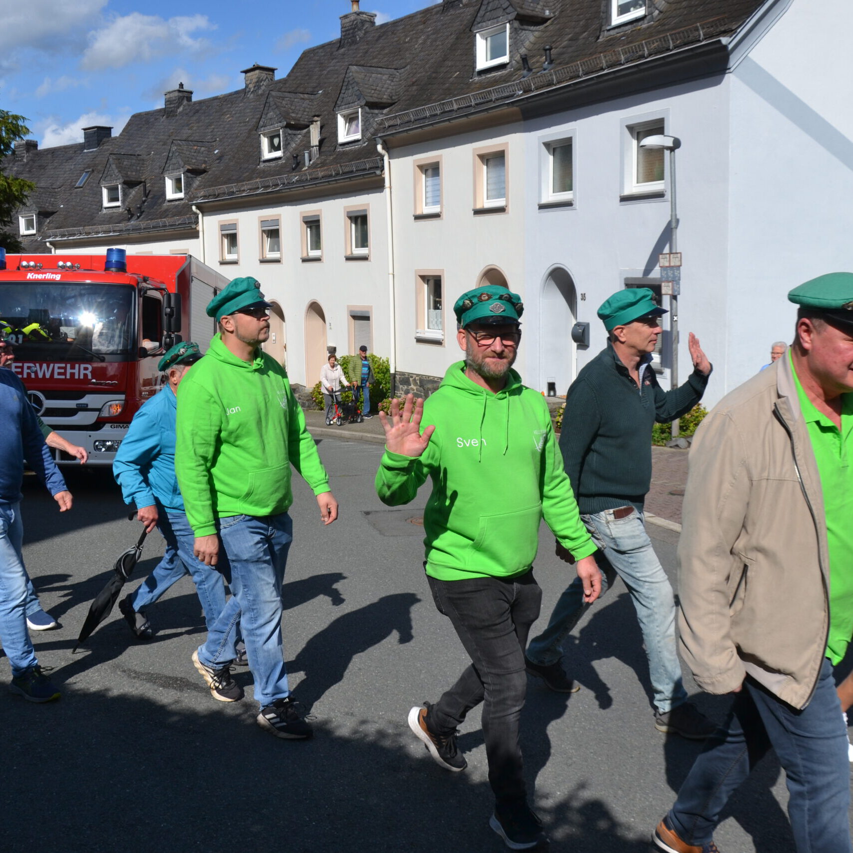 Los ging es am Treffpunkt Knerling-Kreisel – genauer gesagt an der ehemaligen Garage von Klaus Löttgers, dem Begründer des ursprünglichen Brunnenfestes. Heute wird der Ort liebevoll „die kleine Kneipe“ genannt und dient für die Schützen der Kompanie Kelleramt immer als geselliger Startpunkt. Dort sammelten sie sich am Samstag auch, um sich bei einem kleinen Bier auf den bevorstehenden Festmarsch einzustimmen.