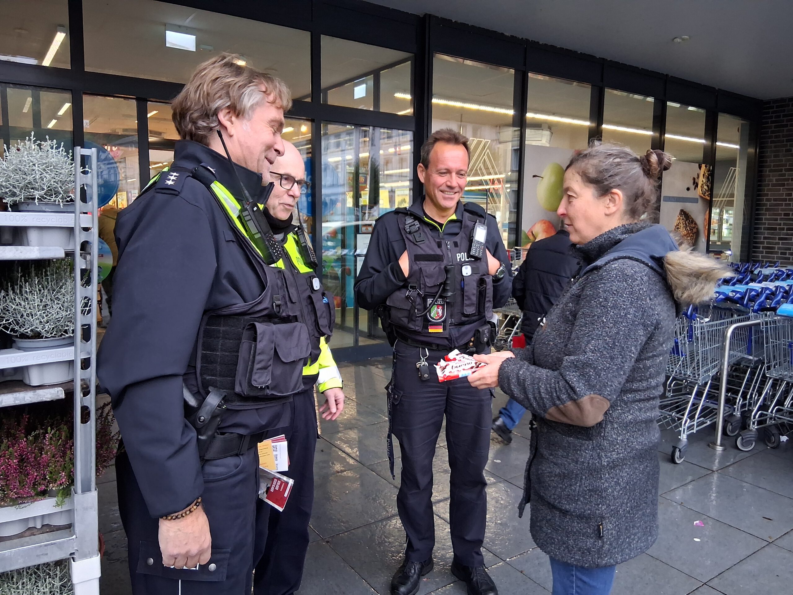 Viele freundliche Begegnungen hatten die Polizeibeamten. Diese Frau wollte ihnen den Einsatz mit Schokoriegeln versüßen, aber: „Das ist sehr nett von Ihnen, aber wir dürfen leider nichts annehmen“, mussten die Beamten leider ablehnen.Doch nicht alle Reaktionen seien positiv gewesen, berichteten die Polizisten. Einige Bürger zeigten sich weniger empfänglich für die Tipps der Kriminalexperten. „Manche meinten, ihnen sei noch nie etwas passiert und das würde auch so bleiben“, berichtete Bielefeld. „Es ist verständlich, dass gerade ältere Menschen, die viele Jahre ohne Vorfälle unterwegs waren, skeptisch reagieren. Dennoch ist es wichtig, sie darauf hinzuweisen, dass sich die Tatmethoden der Taschendiebe ständig ändern und ältere Menschen zunehmend zur Zielgruppe werden.“