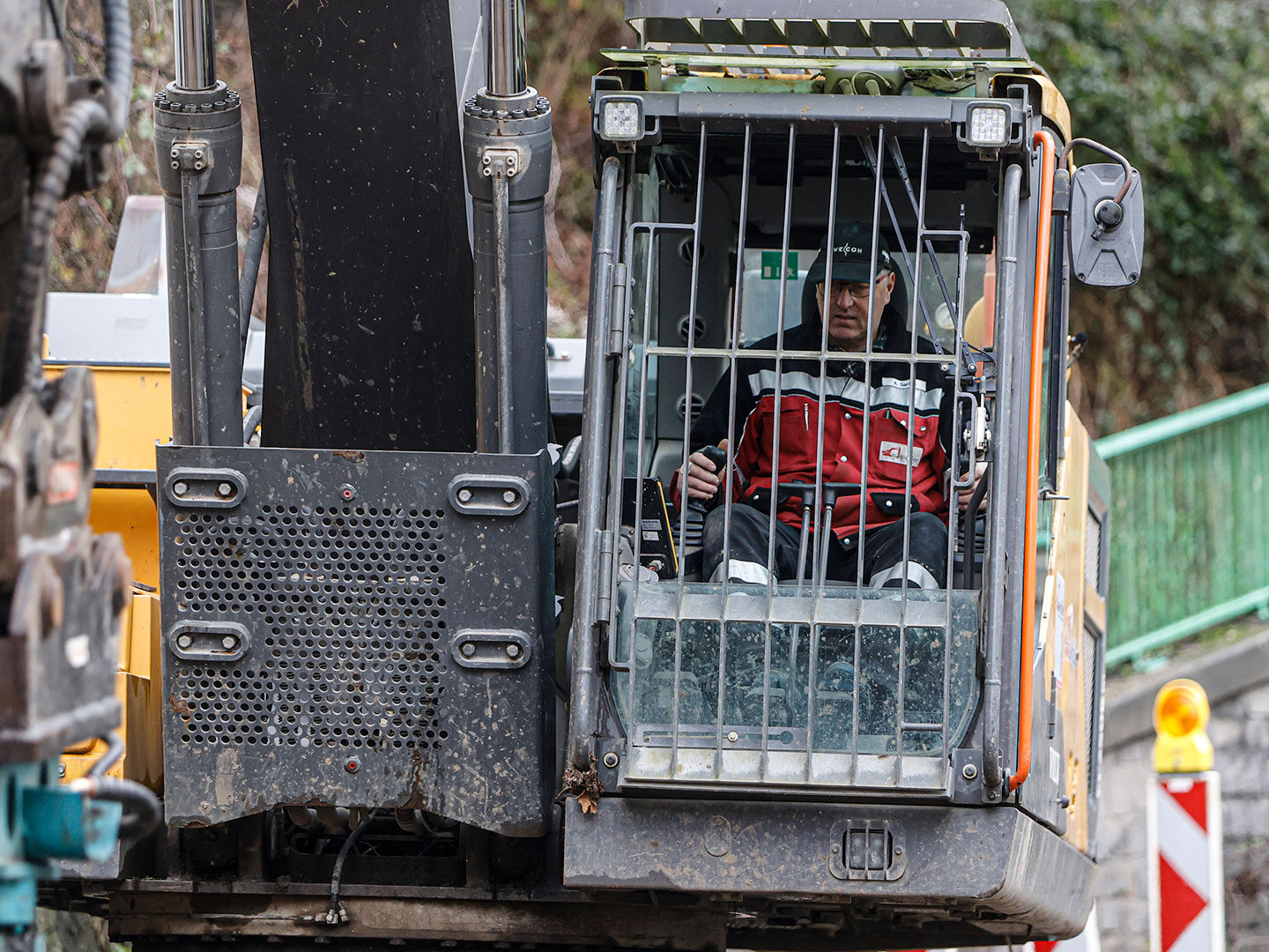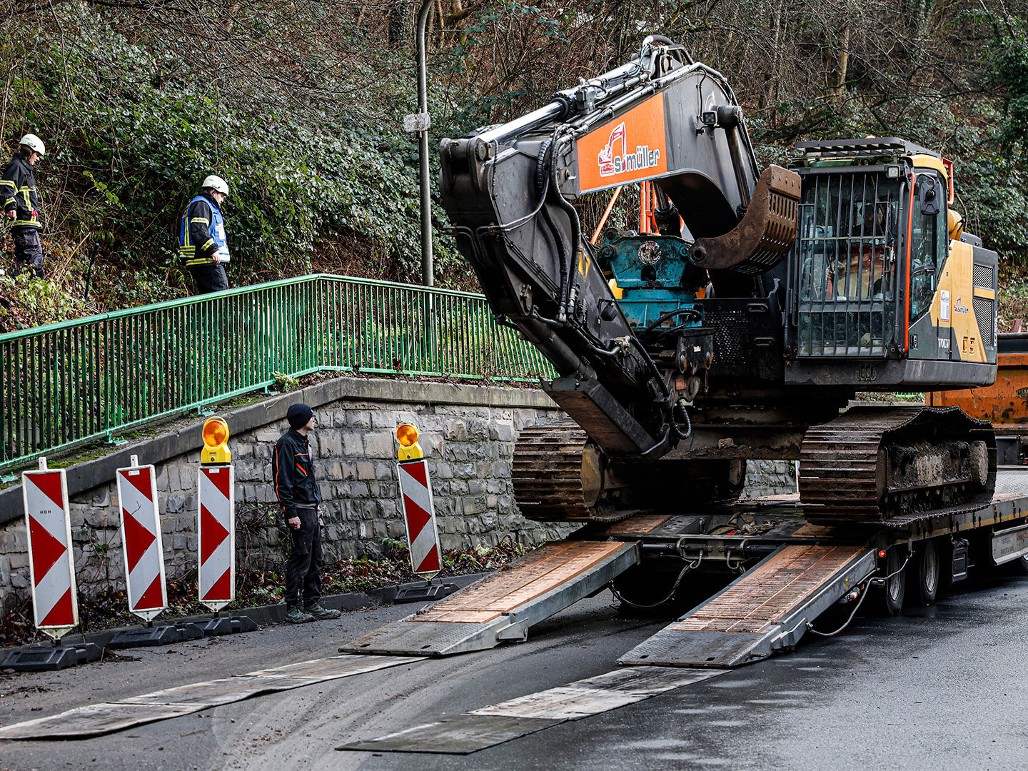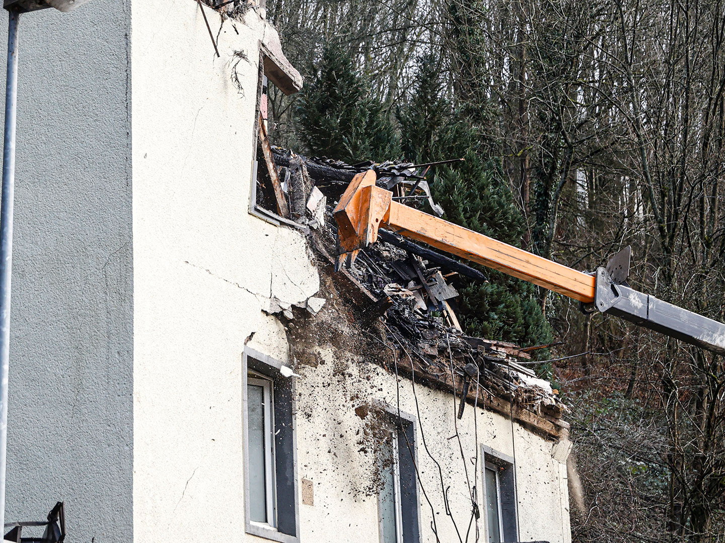 Der Abrissbagger des Unternehmens Müller aus Wiblingwerde steht bereit. Wenn die Suche nach Personen negativ abgeschlossen werden kann, soll der Abriss des einsturzgefährdeten Hauses beginnen.