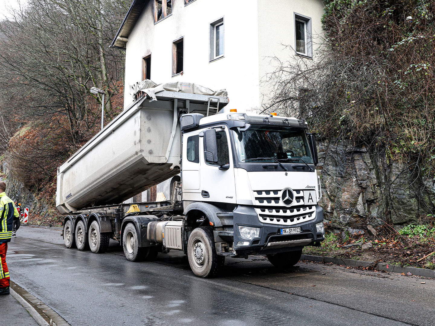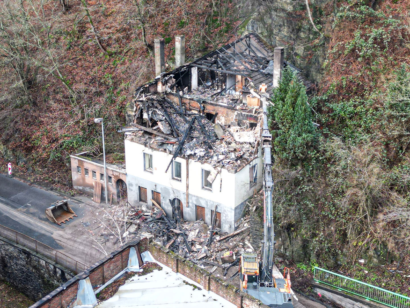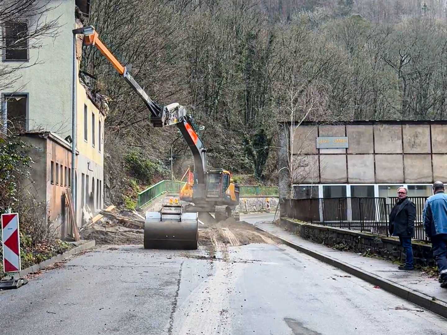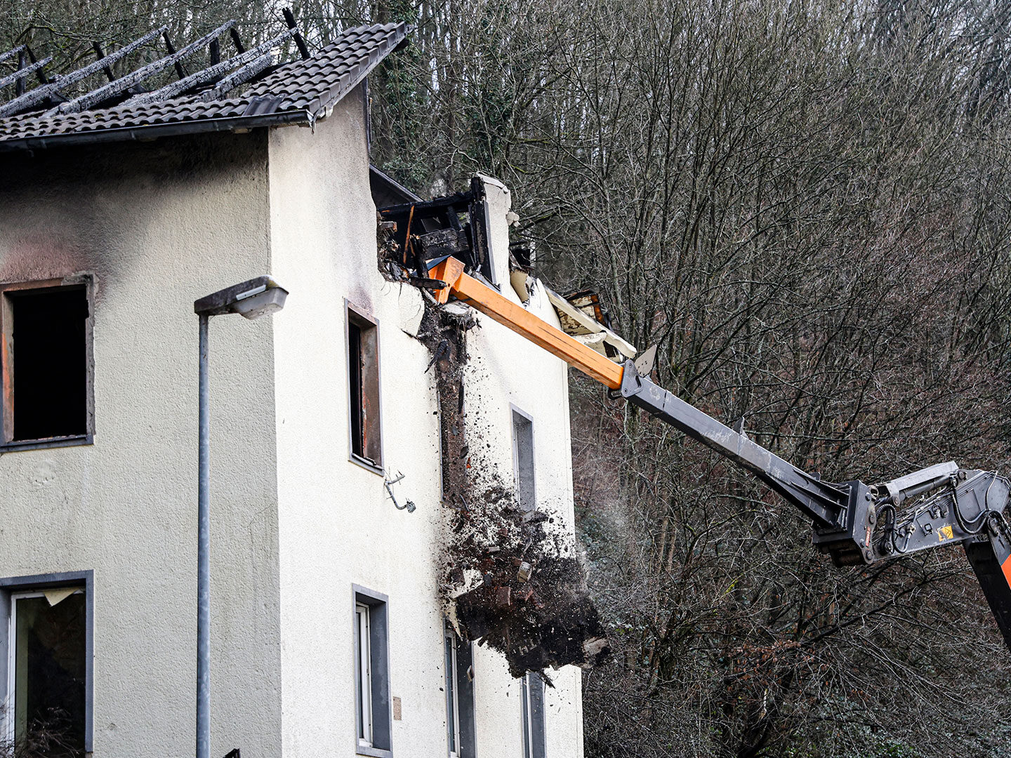 Der Abriss des durch das Feuer einsturzgefährdeten Hauses an der Werdohler Straße in Altena hat begonnen. Die Bundesstraße ist voll gesperrt.
