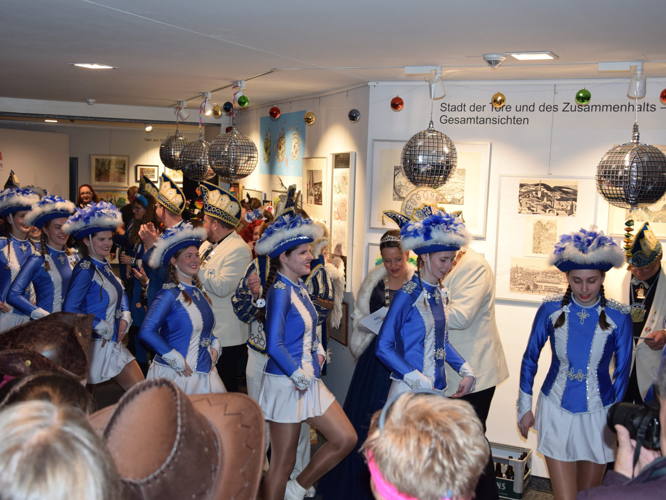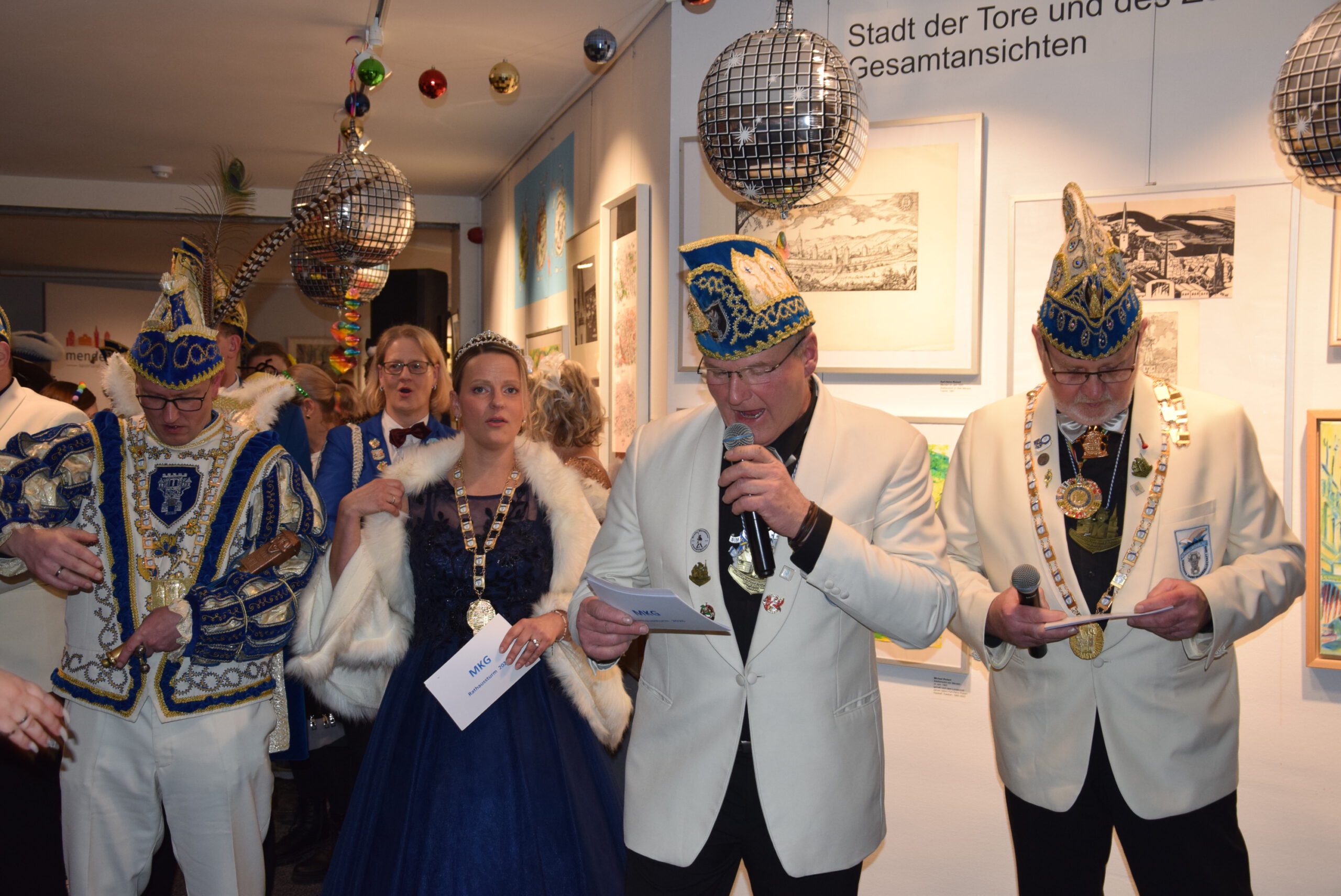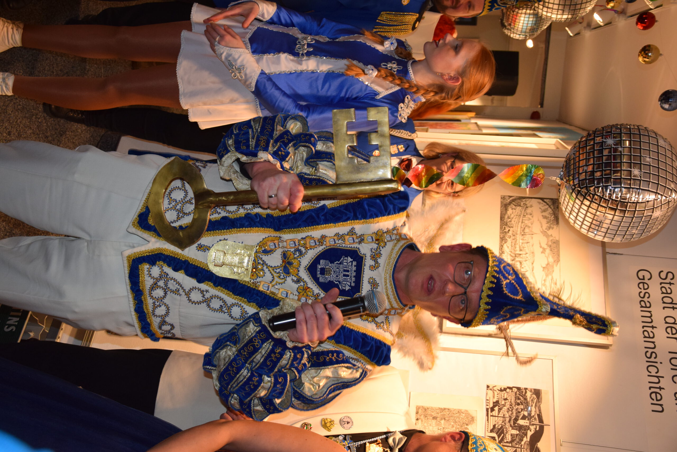 Jörg Spieckermann und Michael Fringes, erster Vorsitzender bzw. Präsident der MKG Kornblumenblau, oblag es, den Rathaussturm anzumoderieren. Sie präsentierten im Rathaus unter anderem einen Tanzauftritt der Turmgarde sowie eine Gesangsdarbietung des Senatorenchores. Ihrer Aufforderung, den Stadtschlüssel herauszurücken, kam Bürgermeisterin Manuela Schmidt zunächst nicht nach. „Im Rathaus regiert Frauenpower, den Schlüssel bekommt ihr nicht“, antwortete Schmidt trotzig. Und auch als Prinzessin Silvia II. Fritzsche das Wort von Frau zu Frau an die erste Bürgerin der Stadt richtete, ließ diese sich noch lange nicht von der Herausgabe des Schlüssels überzeugen.