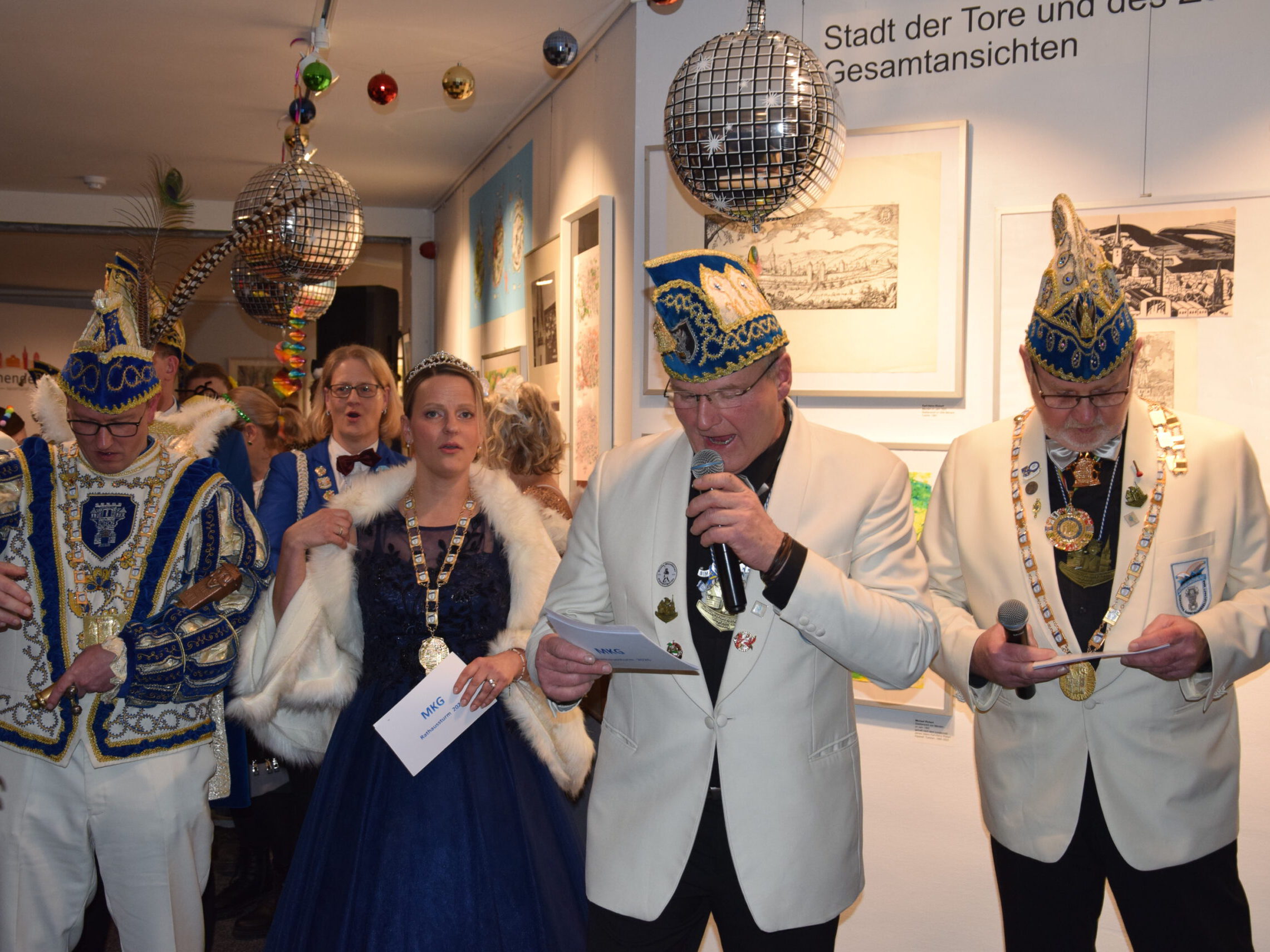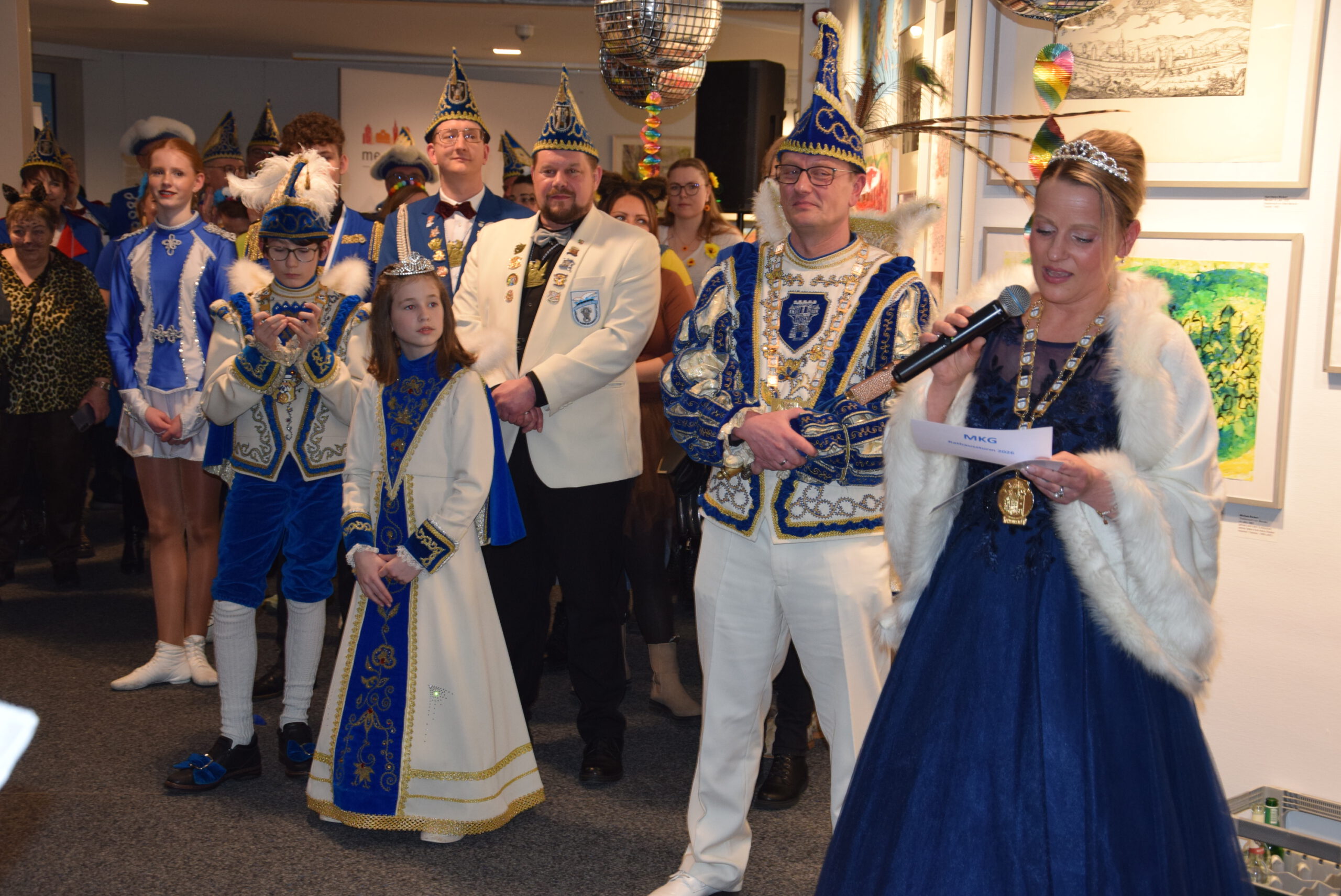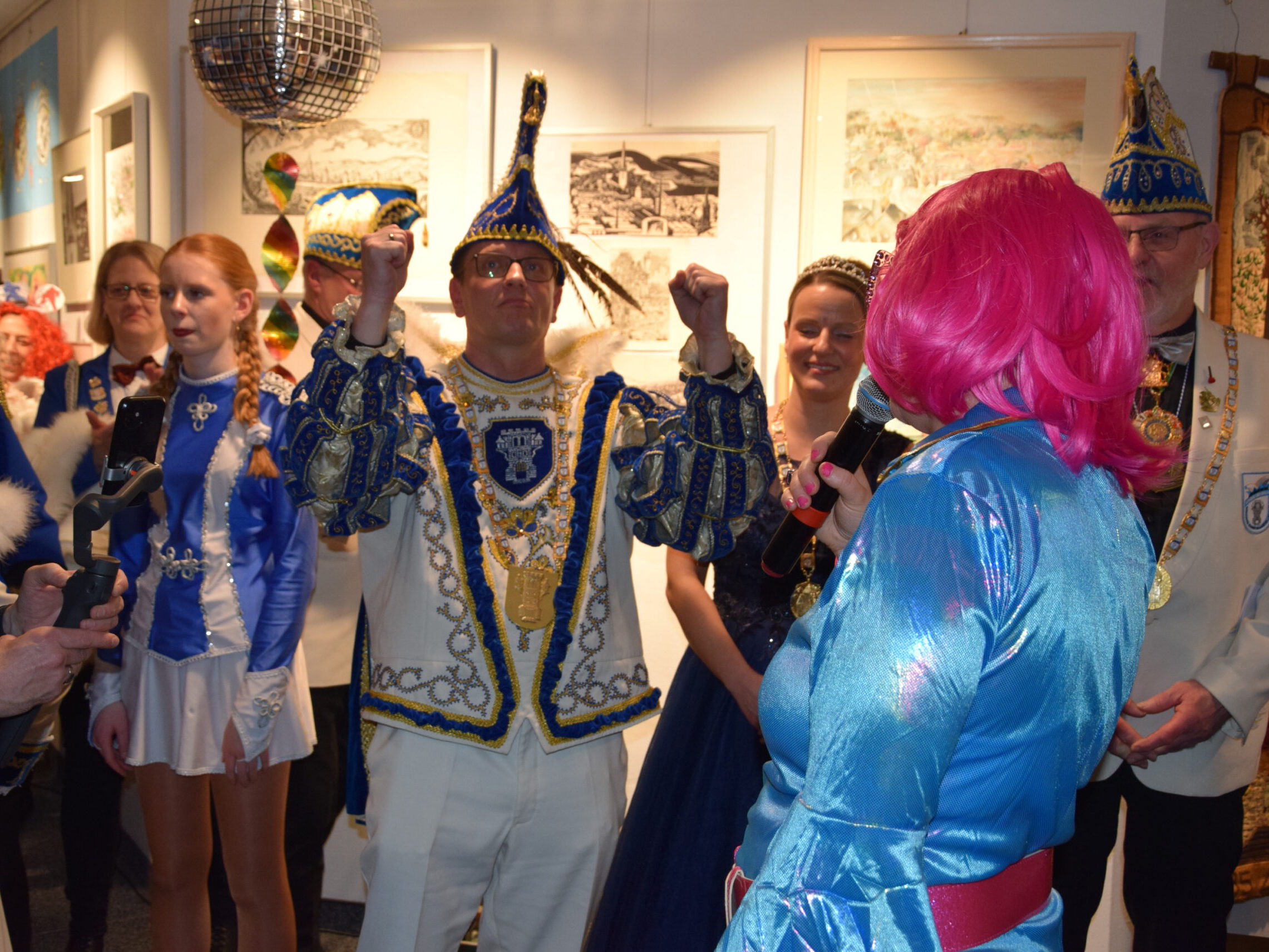 Jörg Spieckermann und Michael Fringes, erster Vorsitzender bzw. Präsident der MKG Kornblumenblau, oblag es, den Rathaussturm anzumoderieren. Sie präsentierten im Rathaus unter anderem einen Tanzauftritt der Turmgarde sowie eine Gesangsdarbietung des Senatorenchores. Ihrer Aufforderung, den Stadtschlüssel herauszurücken, kam Bürgermeisterin Manuela Schmidt zunächst nicht nach. „Im Rathaus regiert Frauenpower, den Schlüssel bekommt ihr nicht“, antwortete Schmidt trotzig. Und auch als Prinzessin Silvia II. Fritzsche das Wort von Frau zu Frau an die erste Bürgerin der Stadt richtete, ließ diese sich noch lange nicht von der Herausgabe des Schlüssels überzeugen.