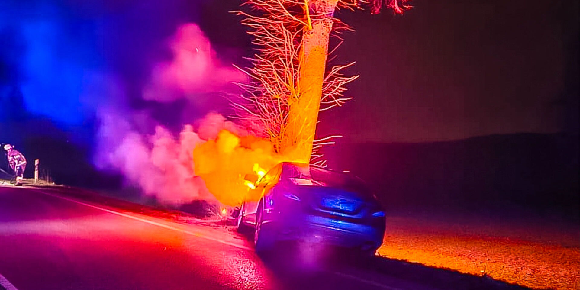 Auf der Landstraße zwischen dem Kreisverkehr Bräukerweg/Glockenblumenweg und der Stadtgrenze zu Iserlohn ist der Fahrer eines Mercedes um kurz vor Mitternacht von der Straße abgekommen und gegen einen Baum geprallt. Der Fahrer konnte sich selbstständig und leicht verletzt aus dem qualmenden Fahrzeug befreien, kurz darauf schlugen Flammen aus dem Motorraum. Die Feuerwehr Menden löschte das Feuer und sicherte die Unfallstelle.