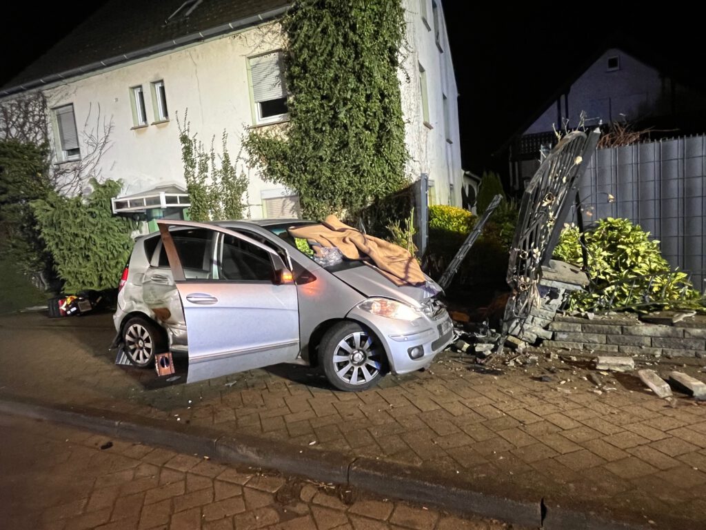 Nach ersten Erkenntnissen ist der Unfall ohne Fremdbeteiligung passiert: Ein Pkw (Mercedes A-Klasse) ist in Fahrtrichtung Altena unterwegs gewesen, als der Wagen gegen 22.35 Uhr in einer leichten Rechtskurve nach links von der Straße abgekommen und über den Gehweg geschleudert ist und vor einem Wohnhaus in eine Mauer samt eisernem Zaun gekracht ist.